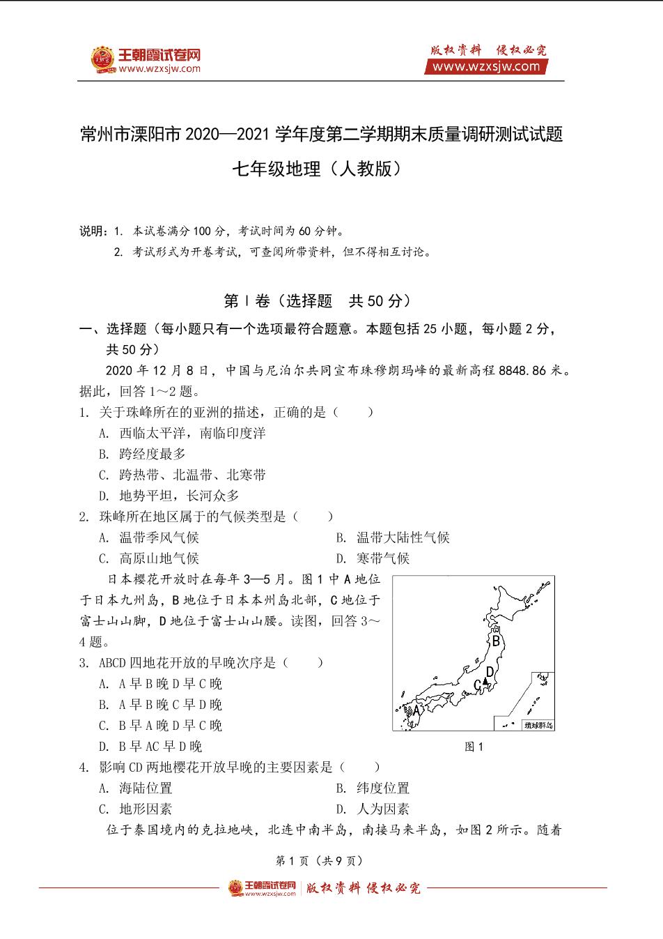 常州市溧阳市2020—2021学年度第二学期期末质量调研测试试题七年级地理(人教版)