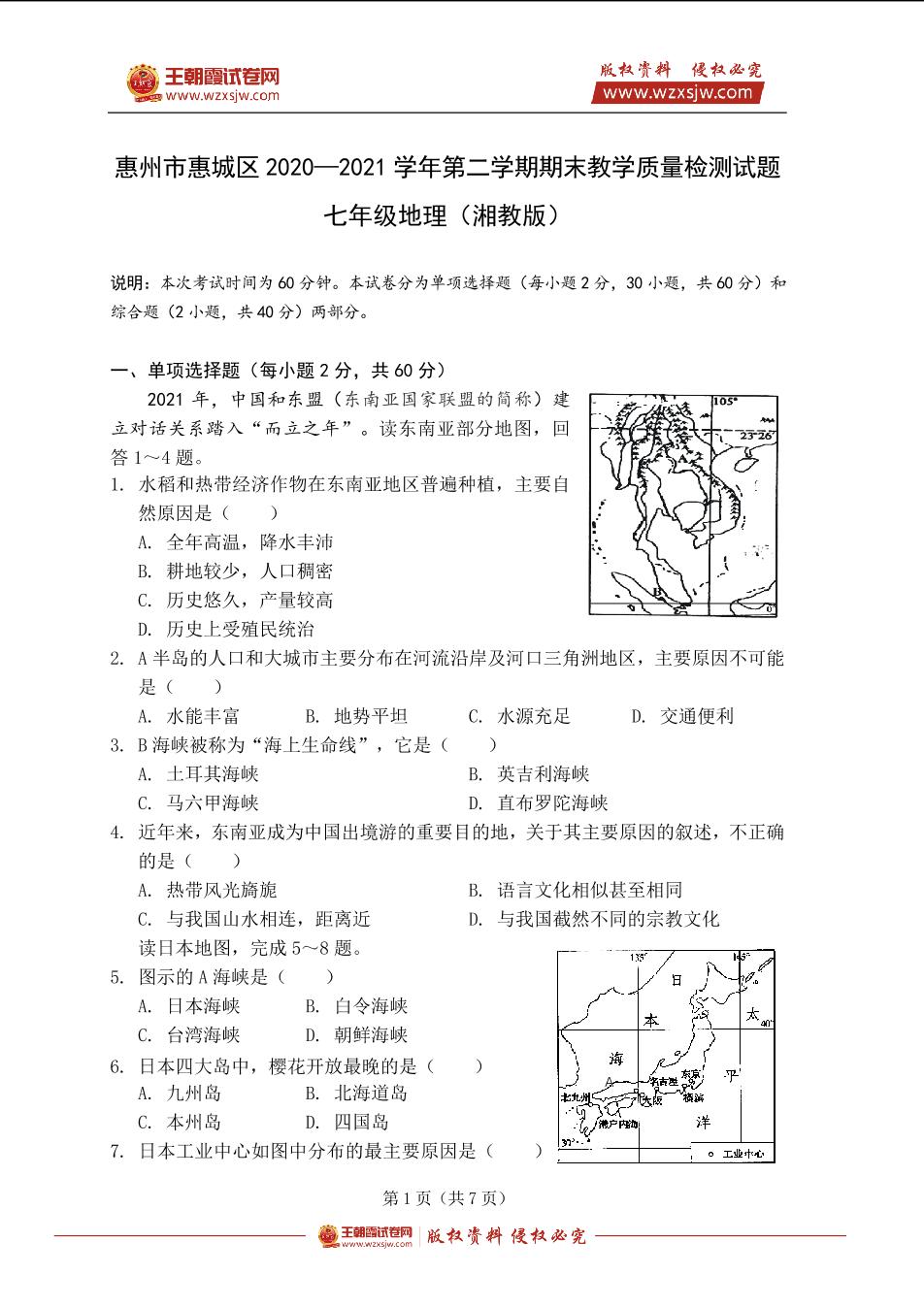 惠州市惠城区2020—2021学年第二学期期末教学质量检测试题七年级地理(湘教版)