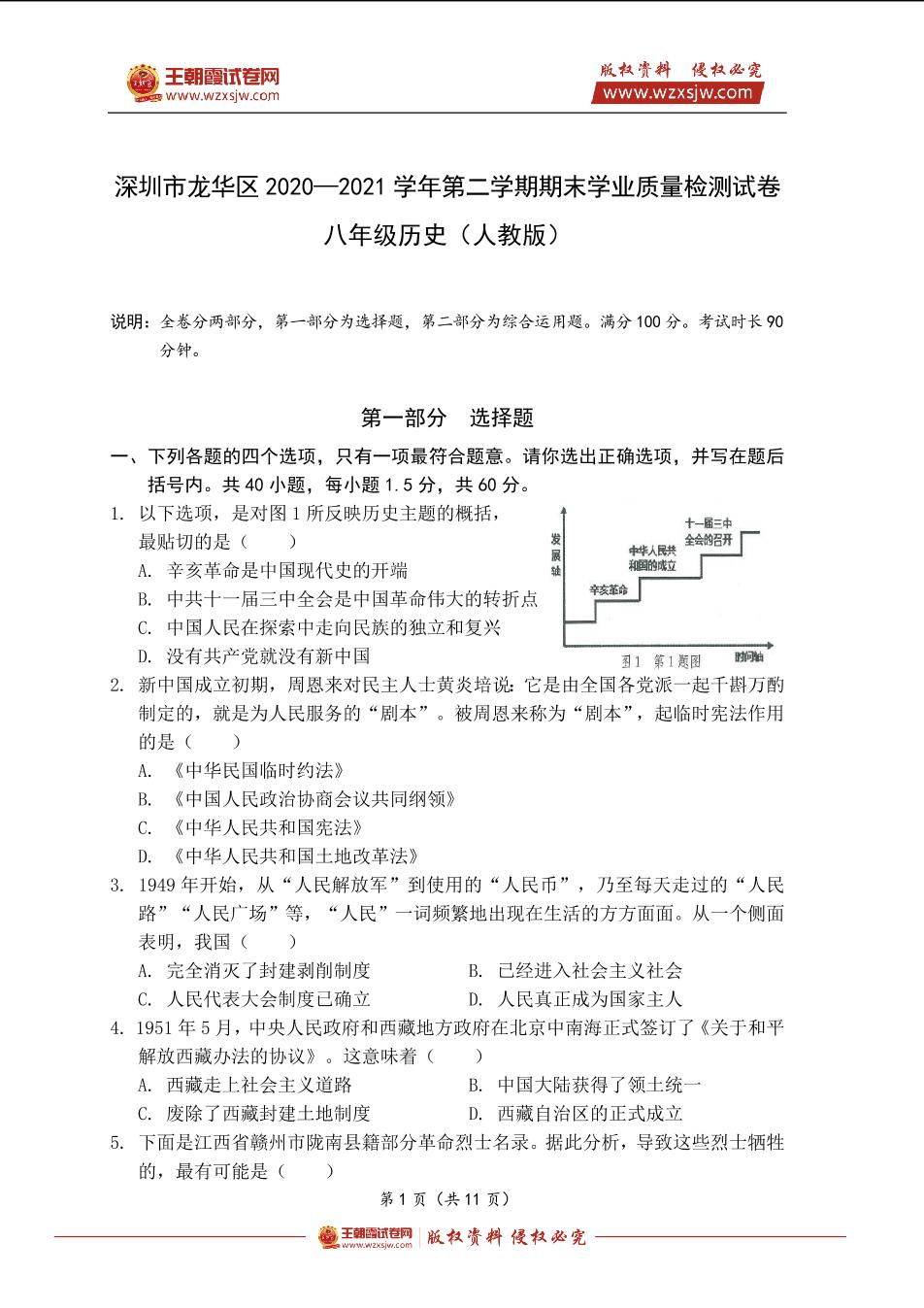 深圳市龙华区2020—2021学年第二学期期末学业质量检测试卷八年级历史(人教版)