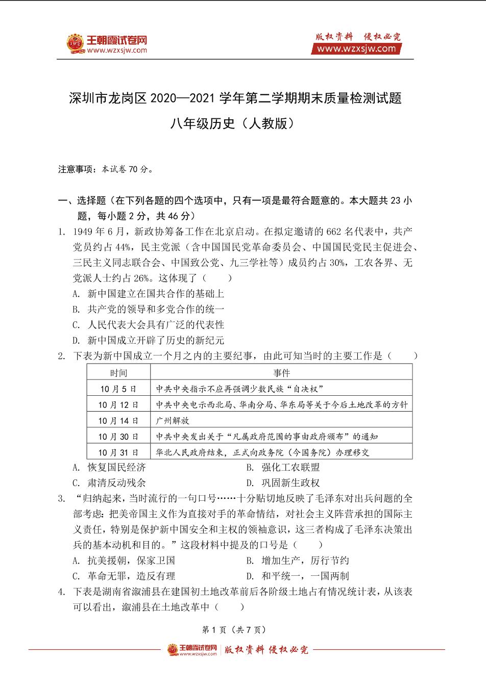 深圳市龙岗区2020—2021学年第二学期期末质量检测试题八年级历史(人教版)