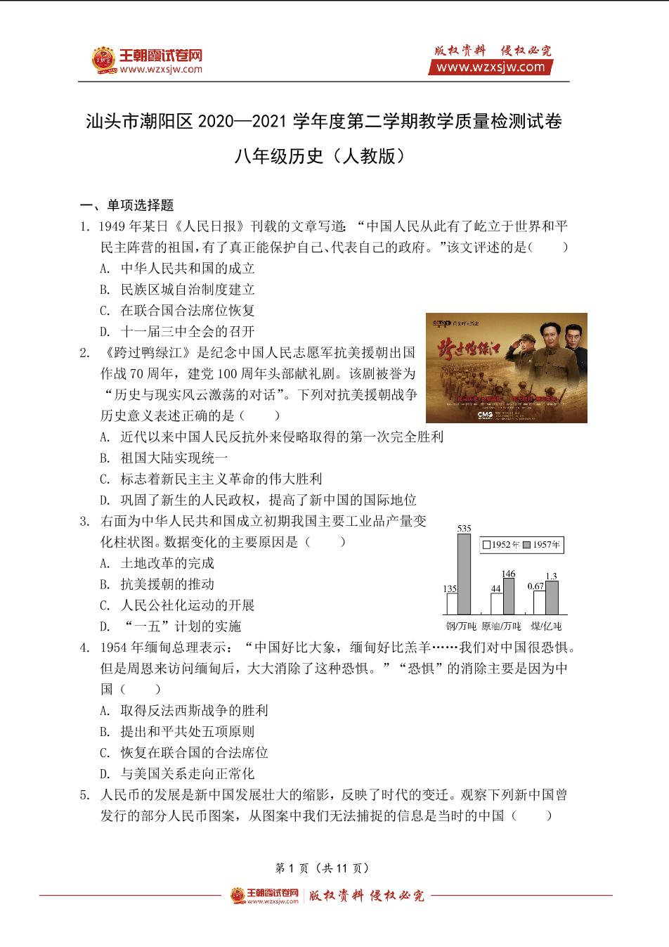 汕头市潮阳区2020—2021学年度第二学期教学质量检测试卷八年级历史(人教版)