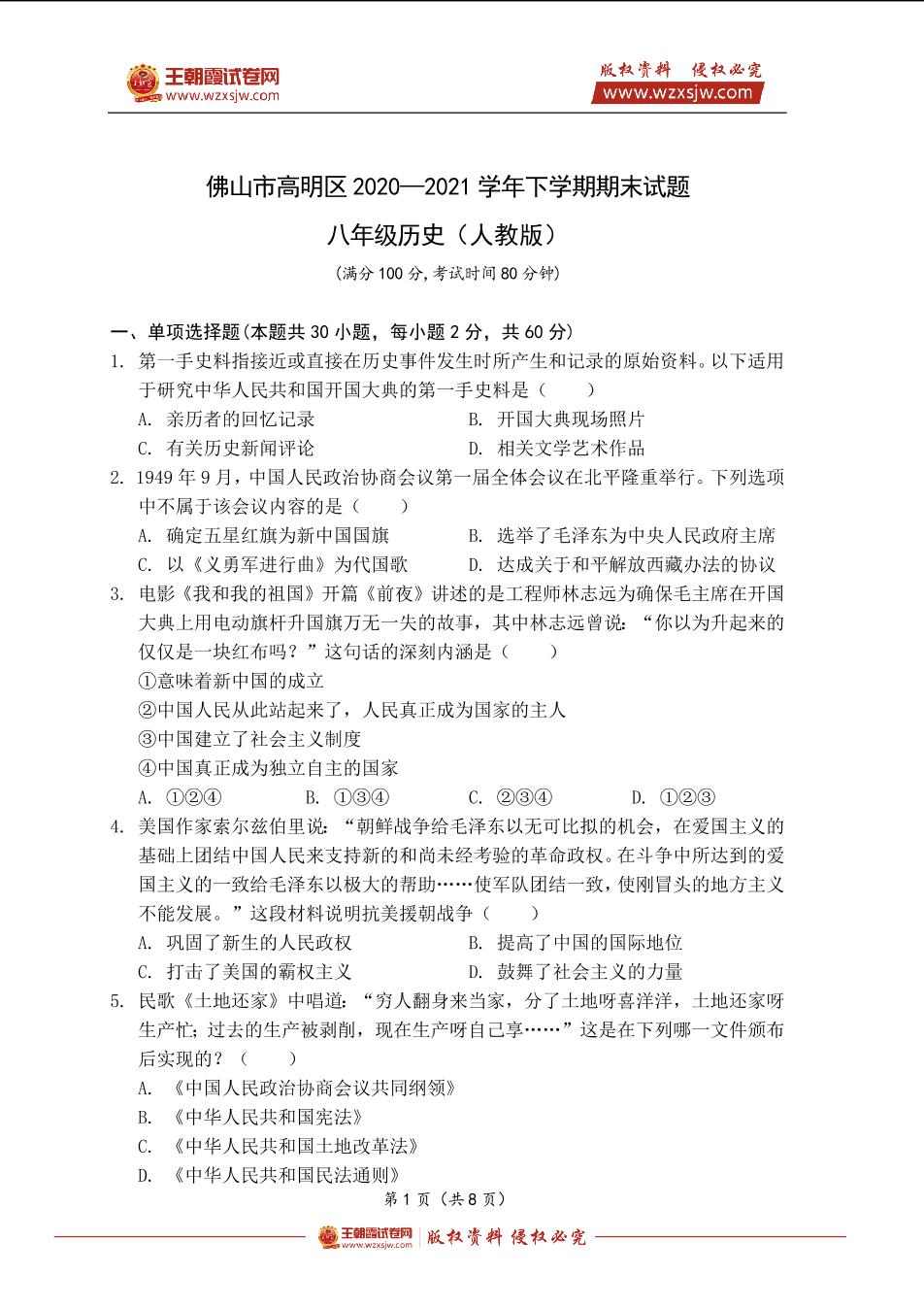 佛山市高明区202—2021学年下学期期末试题八年级历史(人教版)