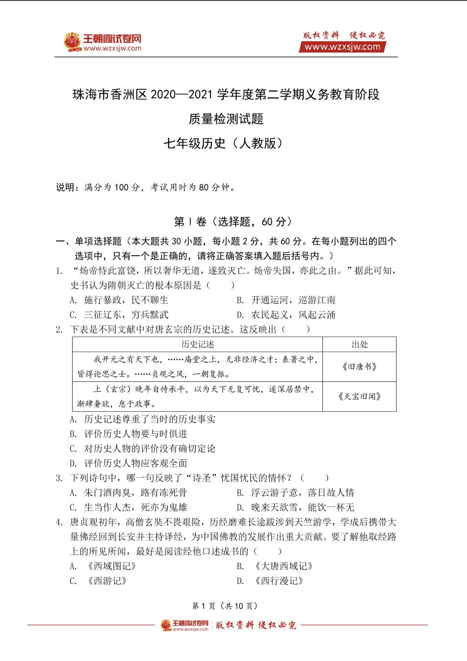 珠海市香洲区2020—2021学年度第二学期义务教育阶段质量检测试题七年级历史(人教版)