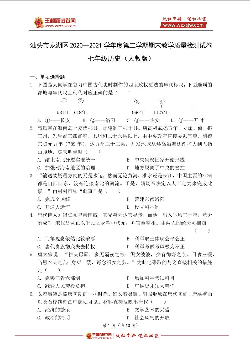 汕头市龙湖区2020—2021学年度第二学期期末教学质量检测试卷七年级历史(人教版)