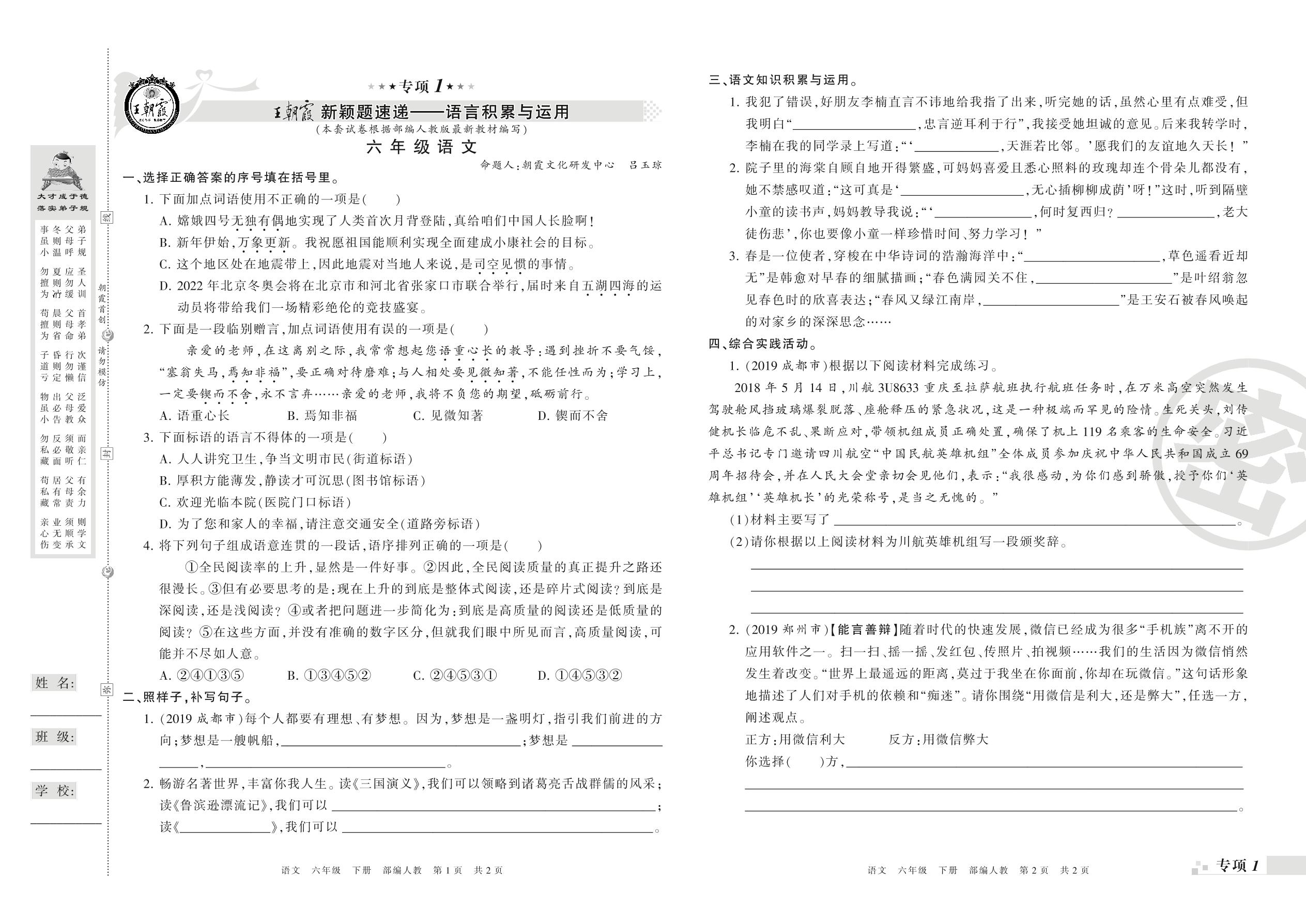 王朝霞期末专项卷——新颖题速递:语言积累与运用、非连续性文本阅读六年级下册语文(人教版)_R21080224858【0】