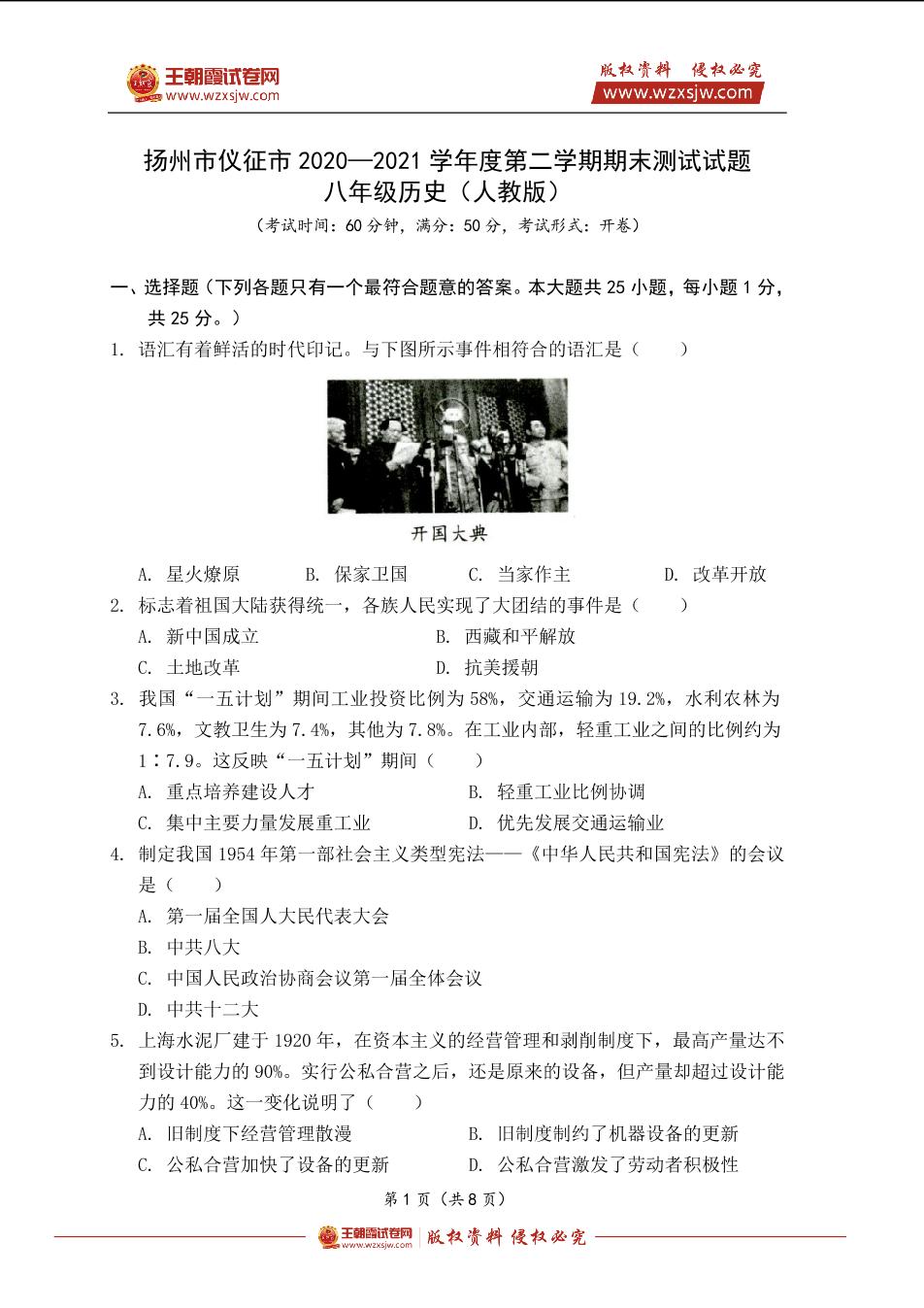 扬州市仪征市2020—2021学年度第二学期期末测试试题八年级历史(人教版)