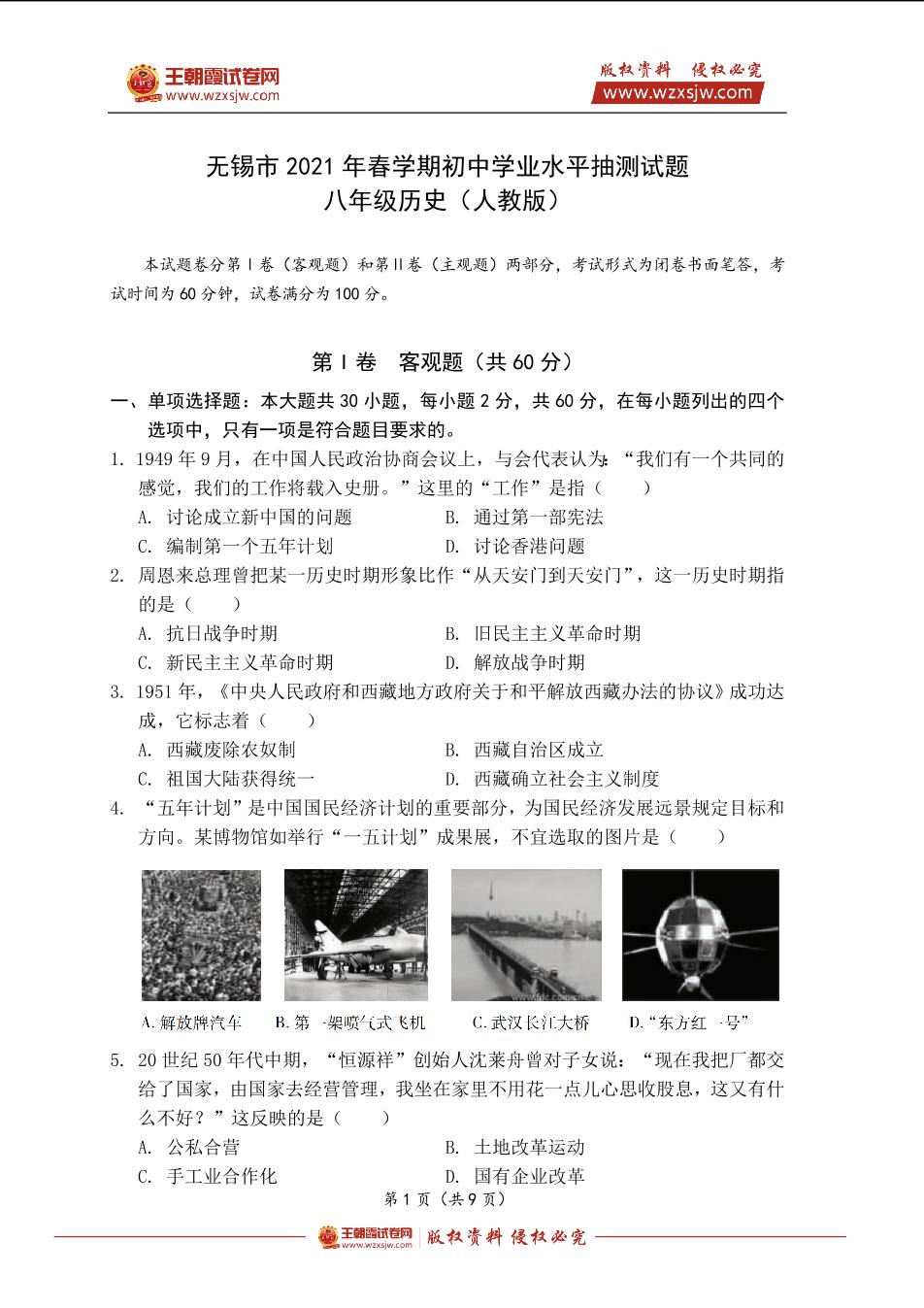 无锡市2021年春学期初中学业水平抽测试题八年级历史(人教版)