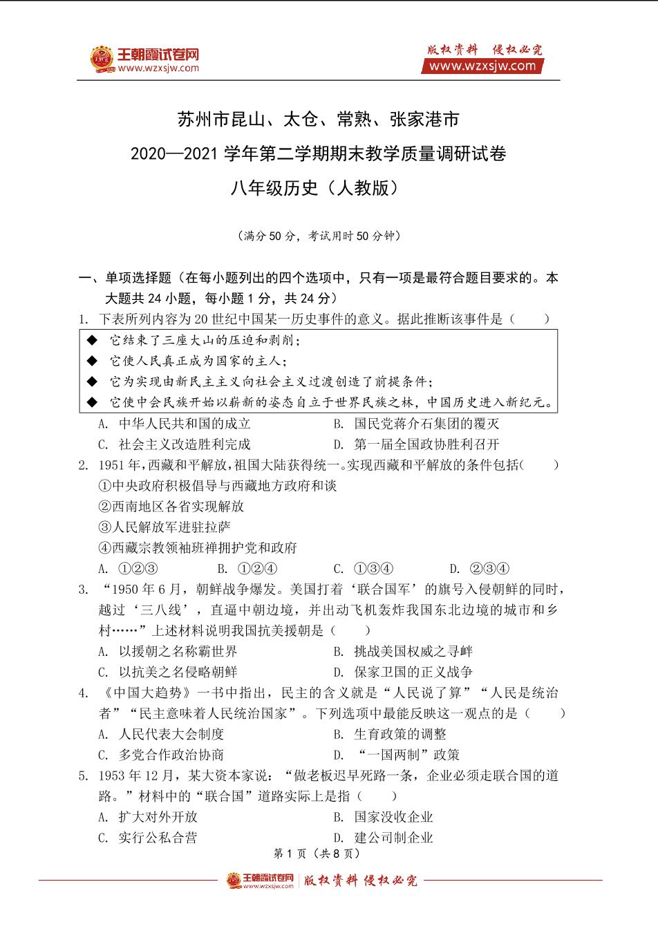苏州市昆山、太仓、常熟、张家港市2020—2021学年第二学期期末教学质量调研试卷八年级历史(人教版)