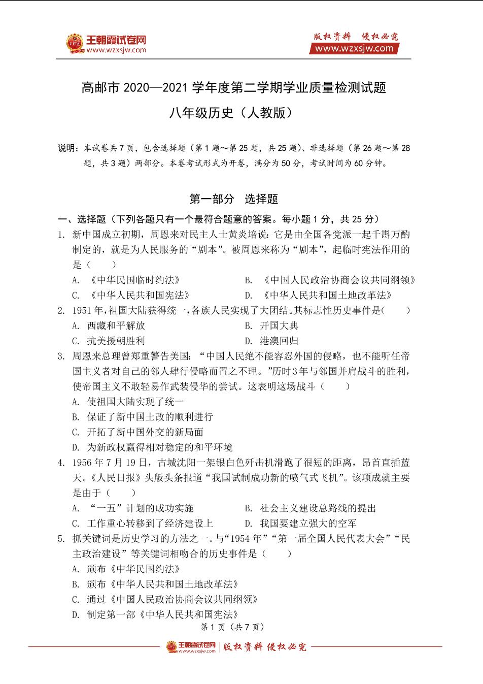 高邮市2020—2021学年度第二学期学业质量检测试题八年级历史(人教版)