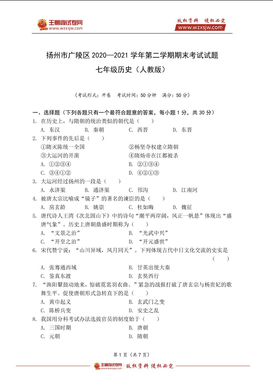扬州市广陵区2020—2021学年第二学期期末考试试题七年级历史(人教版)