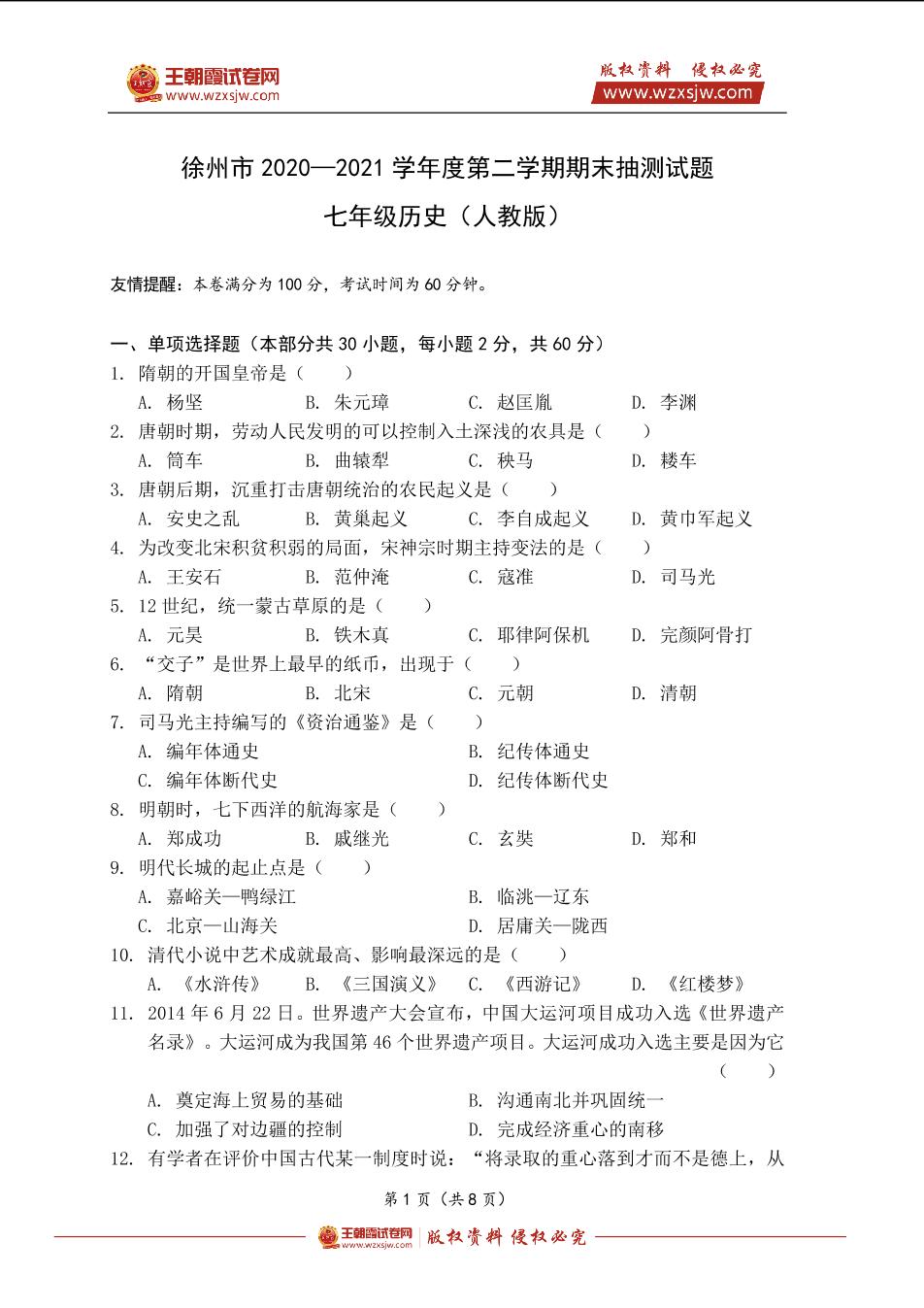 徐州市2020—2021学年度第二学期期末抽测试题七年级历史(人教版)