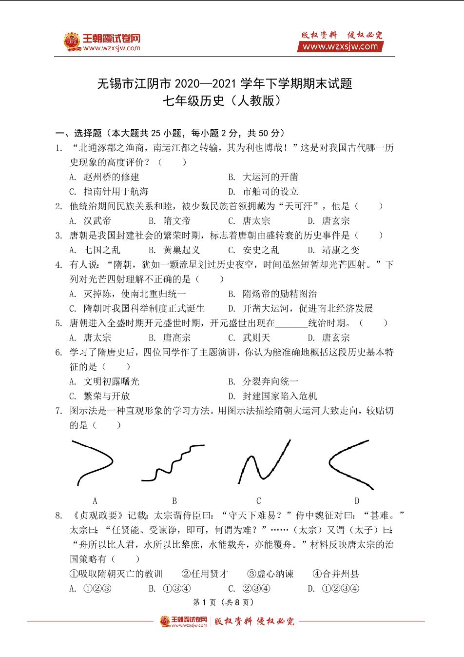 无锡市江阴市2020—2021学年下学期期末试题七年级历史(人教版)