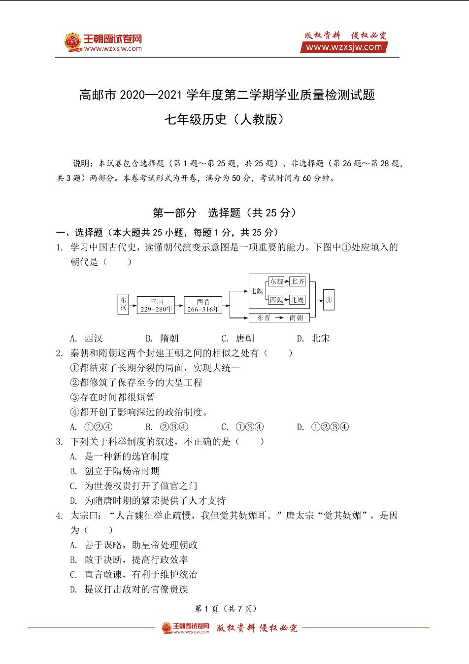 高邮市2020—2021学年度第二学期学业质量检测试题七年级历史(人教版)