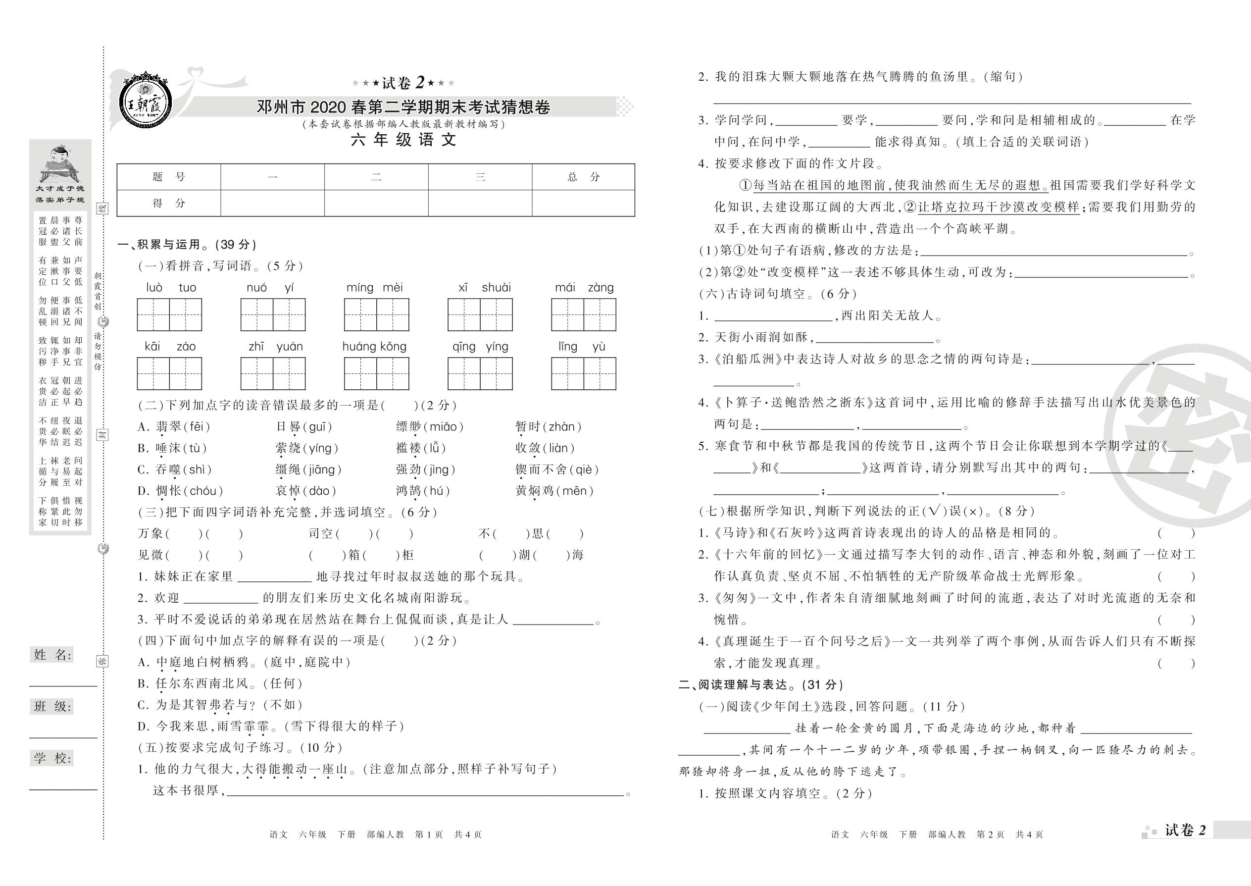 2018-2019学年第二学期邓州市猜想卷六年级语文试卷(人教版)【2】