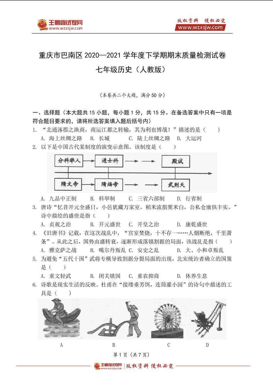 重庆市巴南区2020—2021学年度下学期期末质量检测试卷八年级历史(人教版)