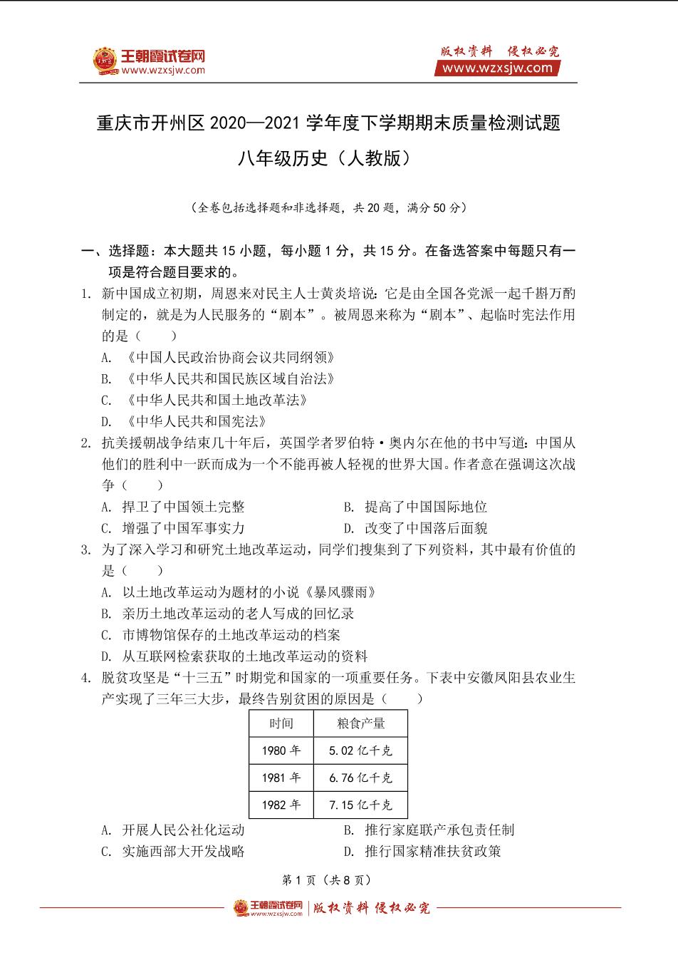 重庆市开州区2020-2021学年度下学期期期末质量检测试题八年级历史(人教版)