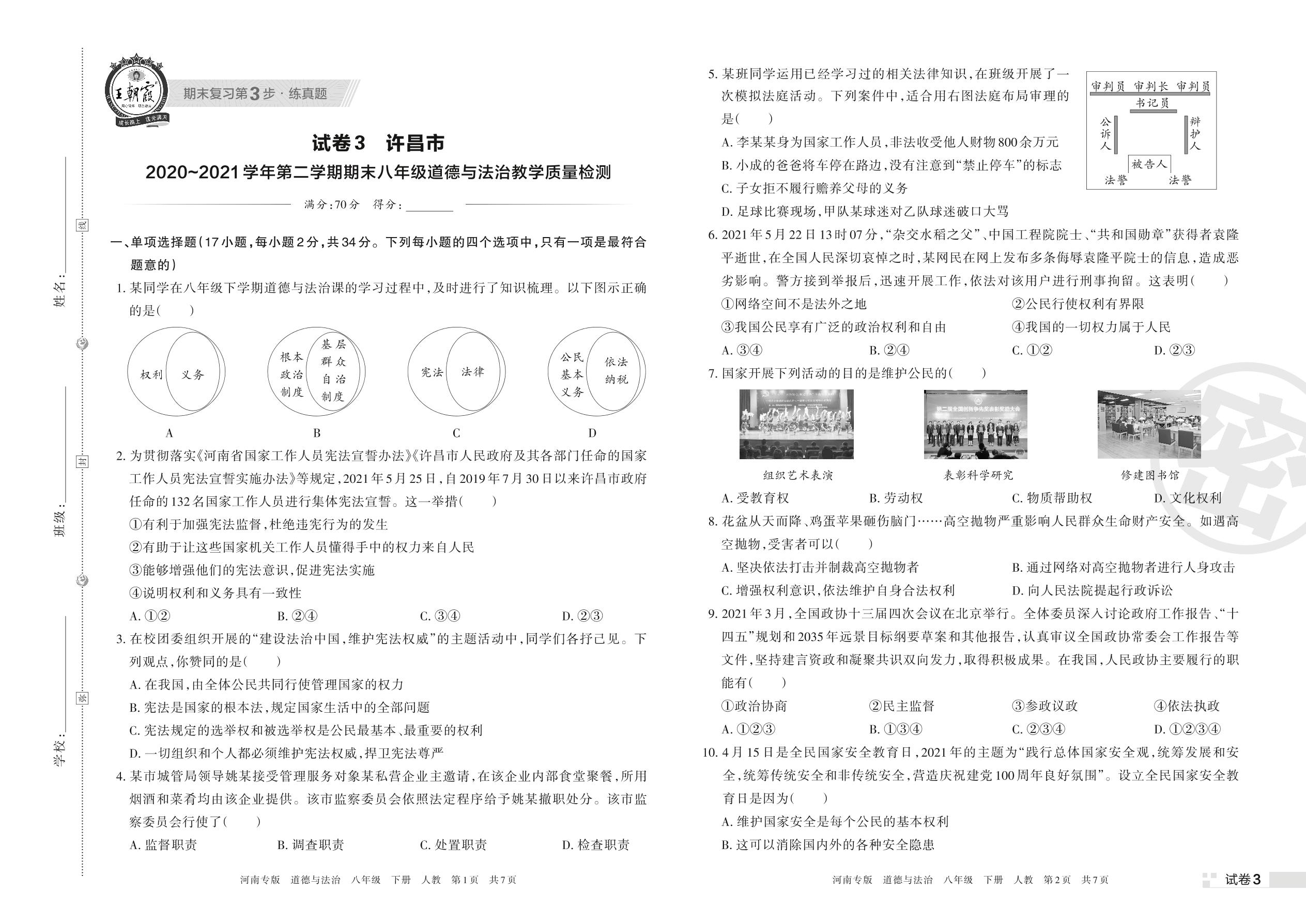 许昌市2020~2021学年第二学期期末八年级道德与法治教学质量检测(人教版)【3】