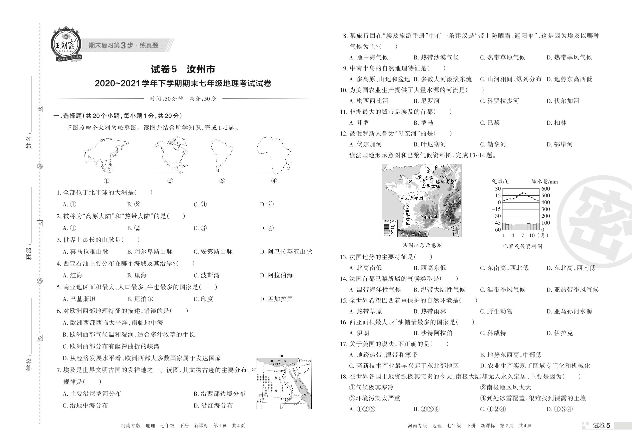 汝州市2020~2021学年下学期期末七年级地理考试试卷(新课标)【5】