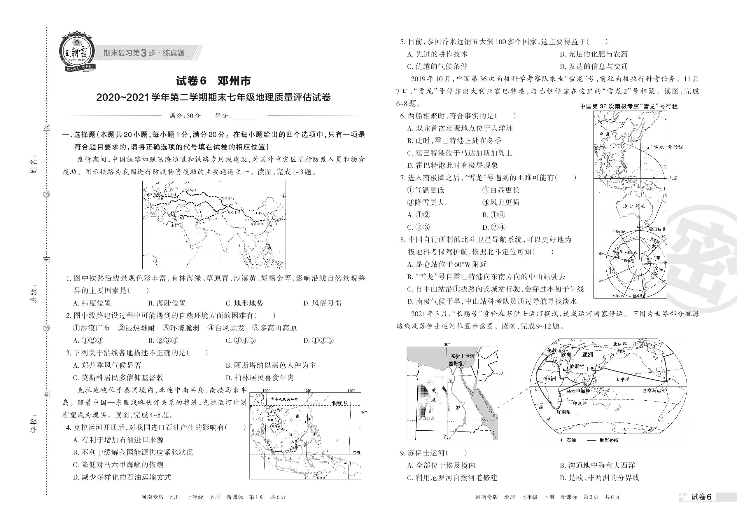 邓州市2020~2021学年第二学期期末七年级地理质量评估试卷(新课标)【6】