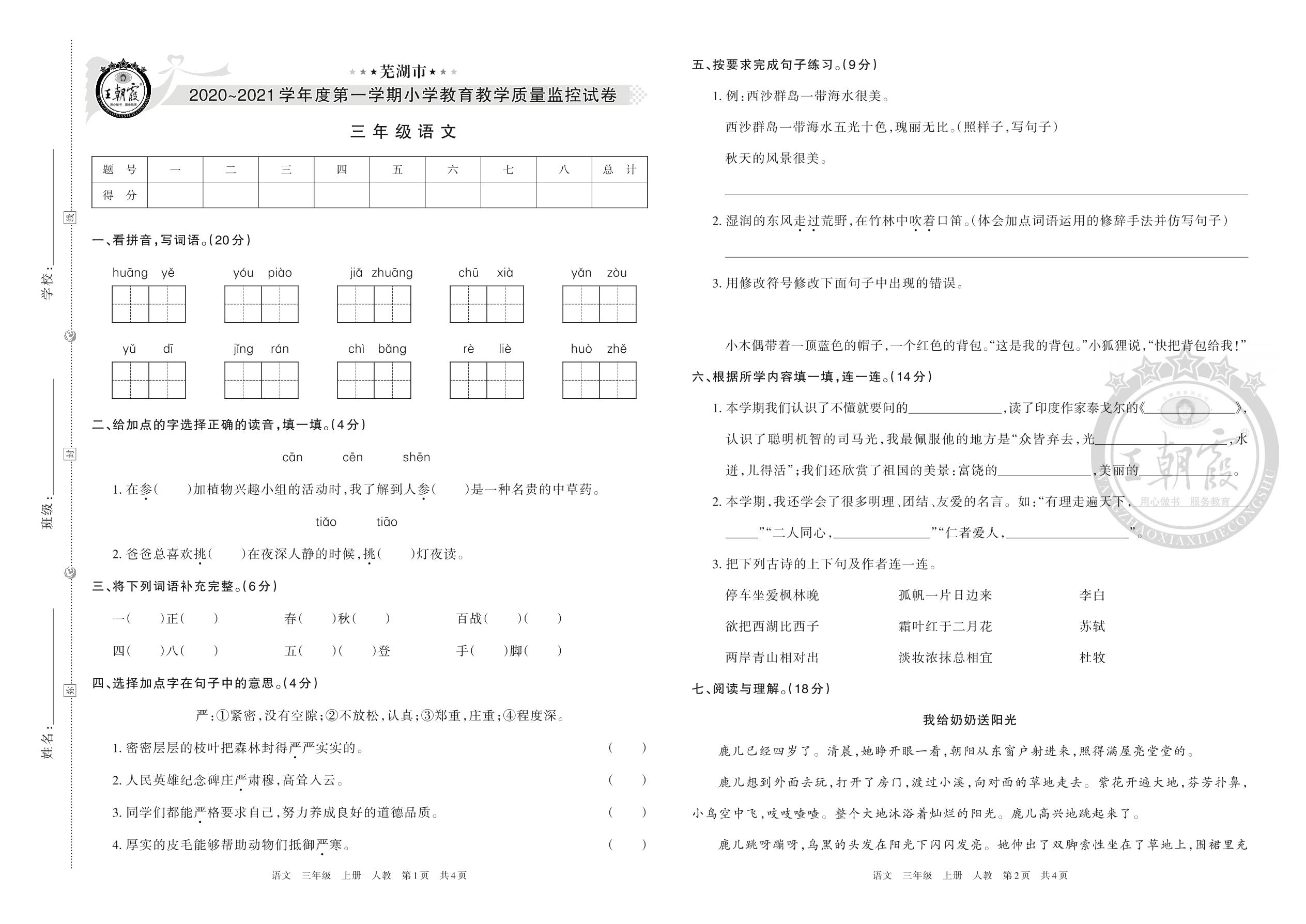 芜湖市2020~2021学年度第一学期小学教育教学质量监控试卷三年级语文(人教版)