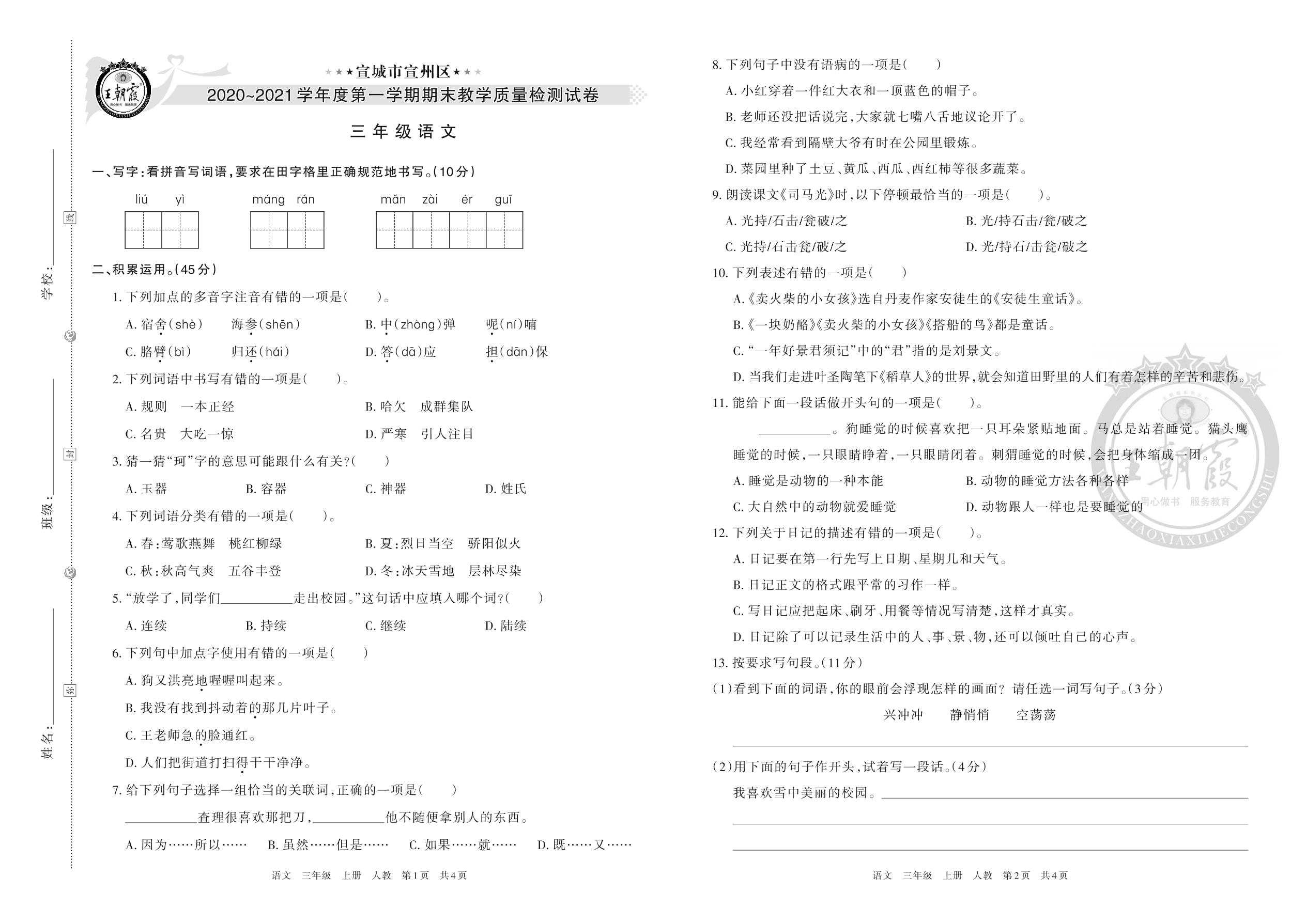 宣城市宣州区2020~2021学年度第一学期期末质量检测试卷三年级语文(人教版)