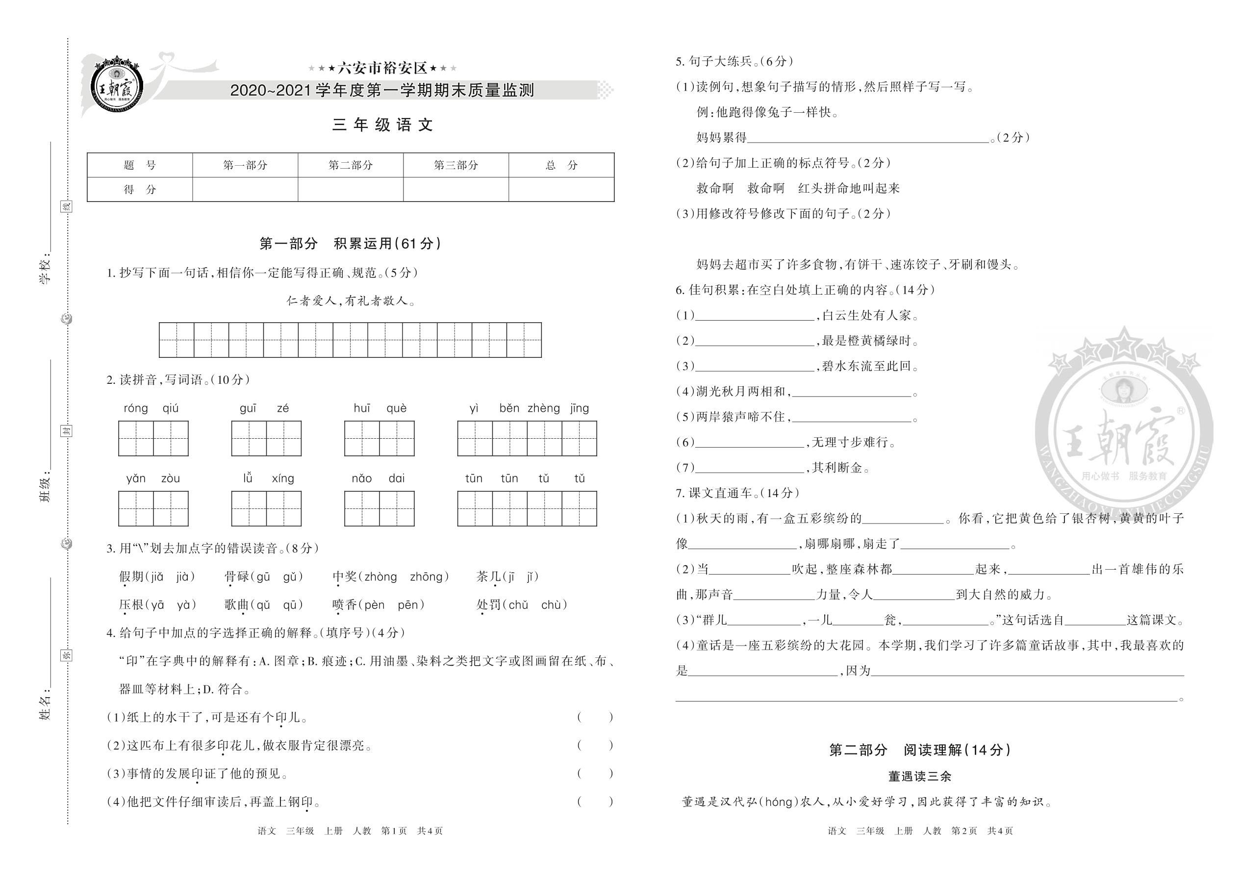 六安市裕安区2020~2021学年度第一学期期末质量监测三年级语文(人教版)