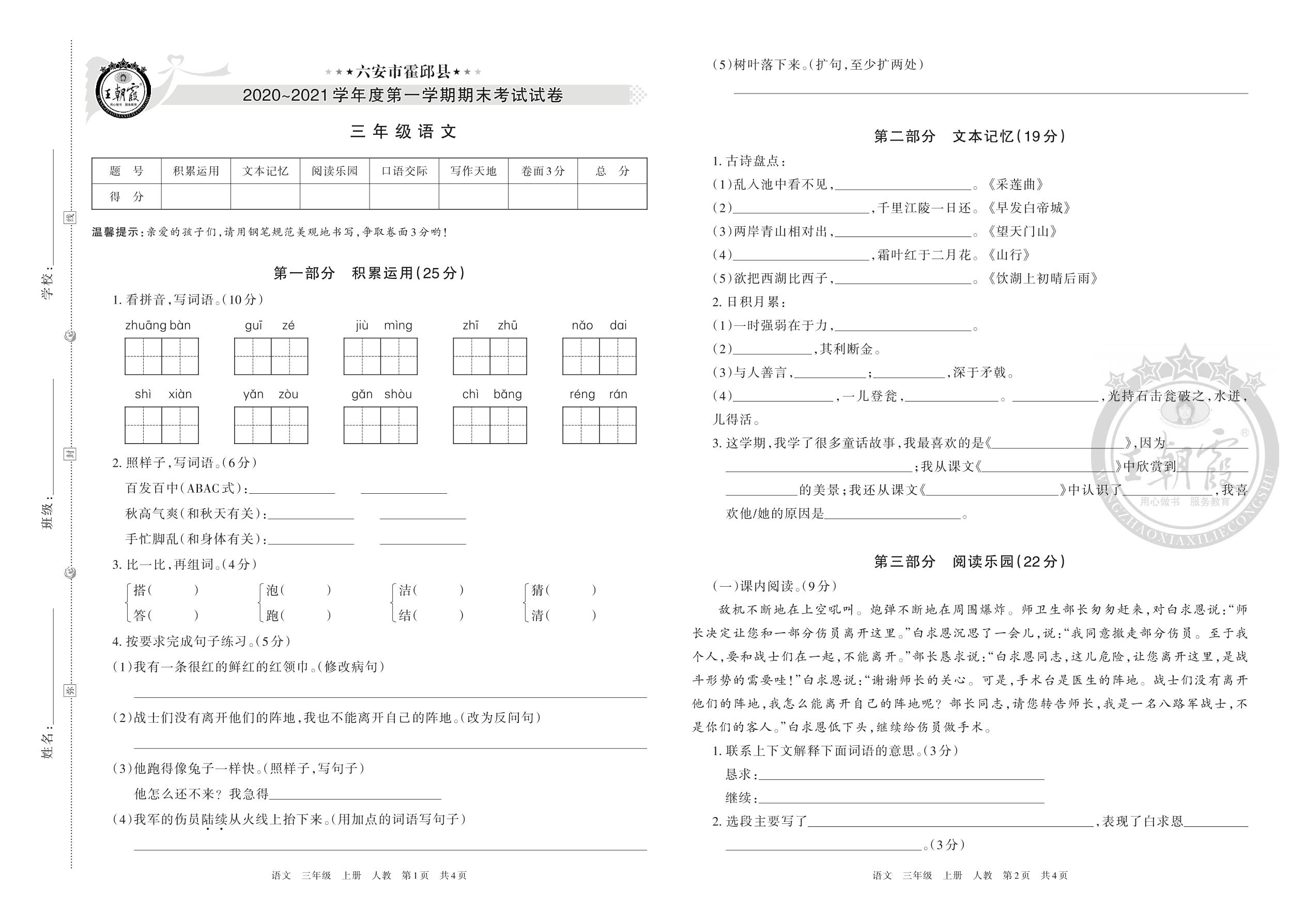 六安市霍邱县2020~2021学年度第一学期期末考试试卷三年级语文(人教版)