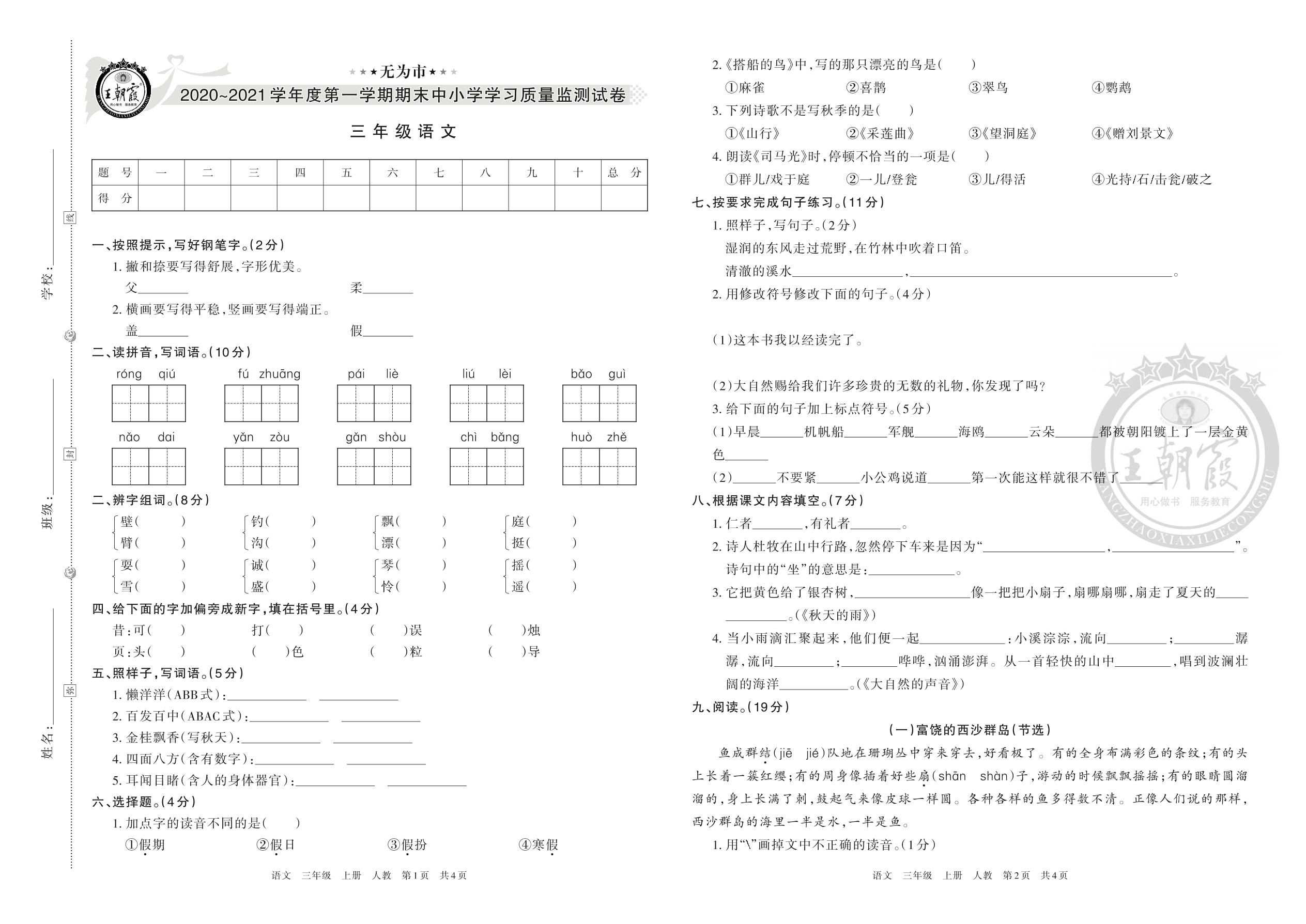 无为市2020~2021学年度第一学期期末中小学学习质量监测试卷三年级语文(人教版)