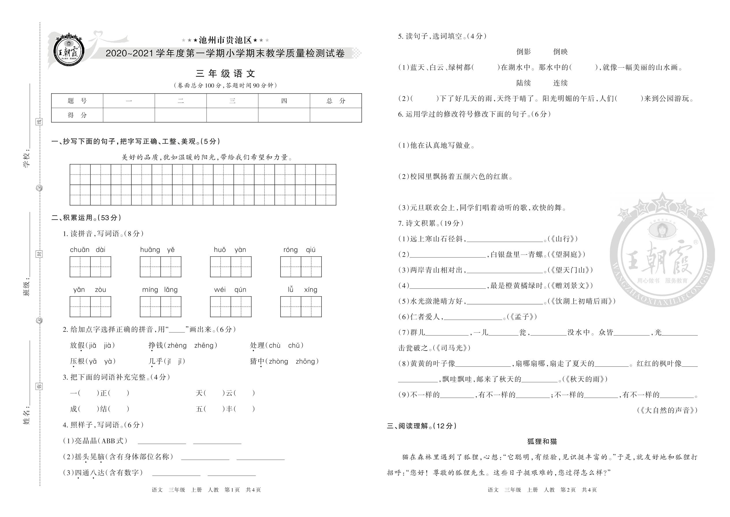 池州市贵池区2020~2021学年度第一学期小学期末教学质量监测测试卷三年级语文(人教版)