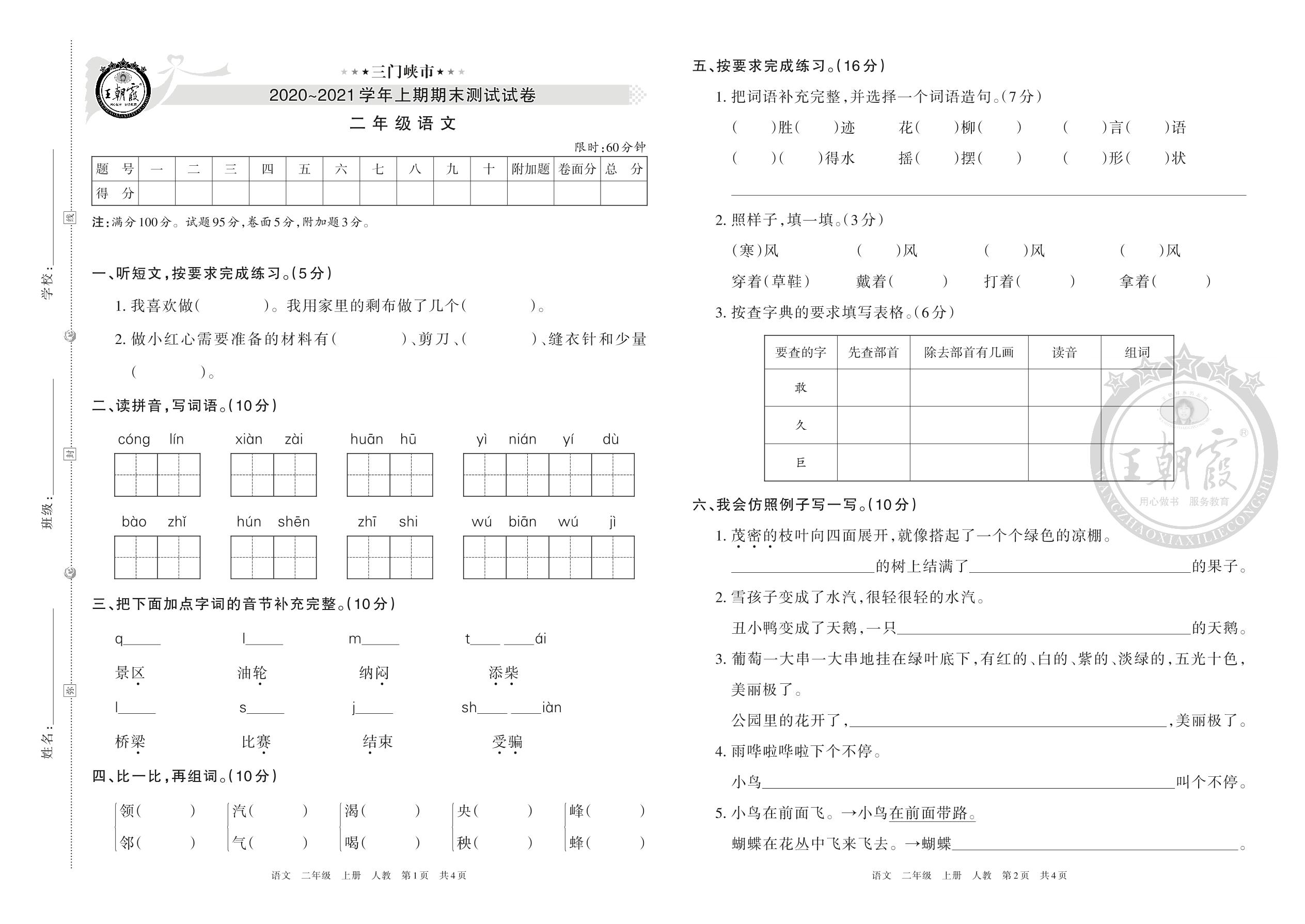 三门峡市2020~2021学年上期期末测试试卷二年级语文(人教版)