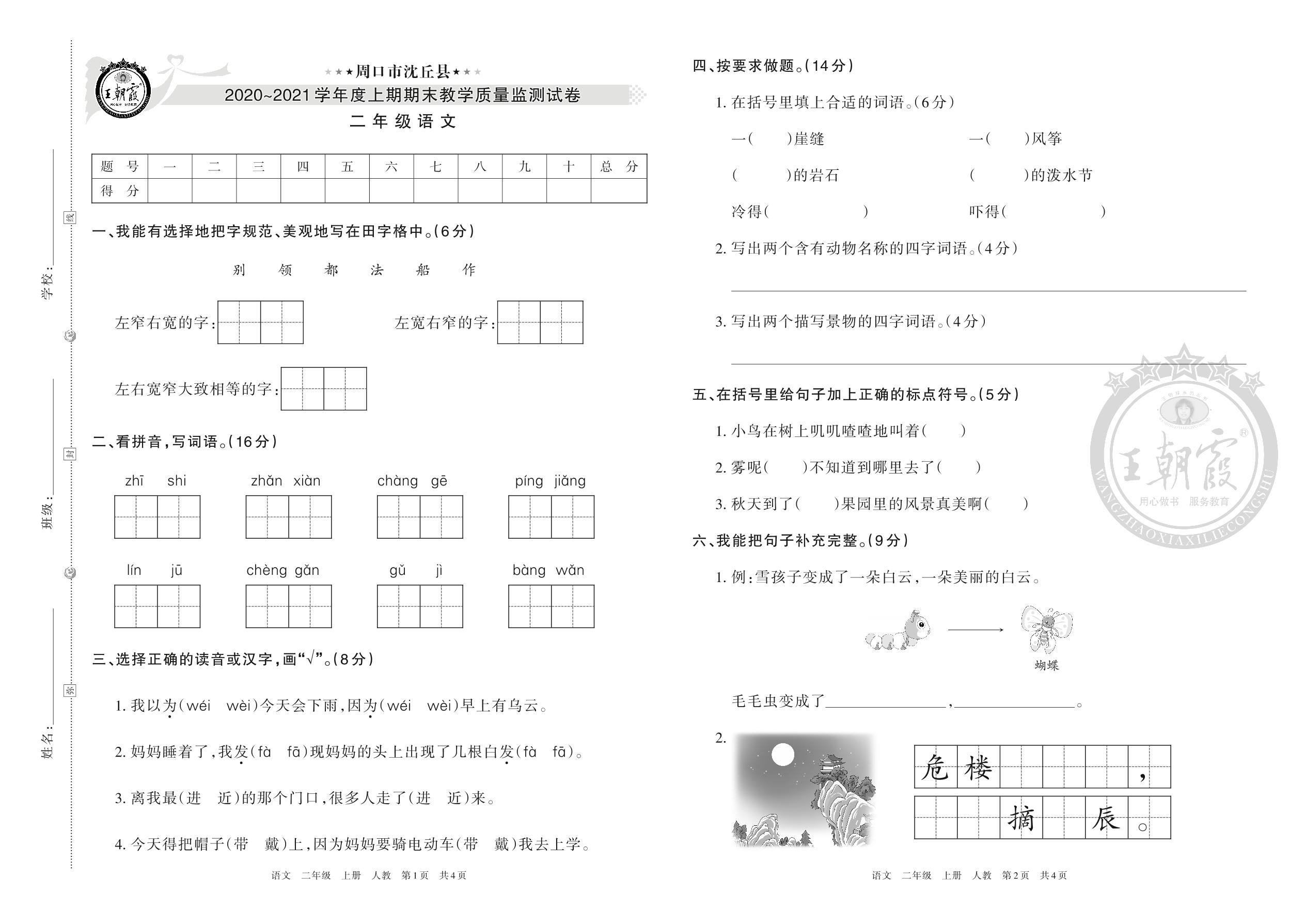 周口市沈丘县2020~2021学年度上期期末教学质量监测试卷二年级语文(人教版)