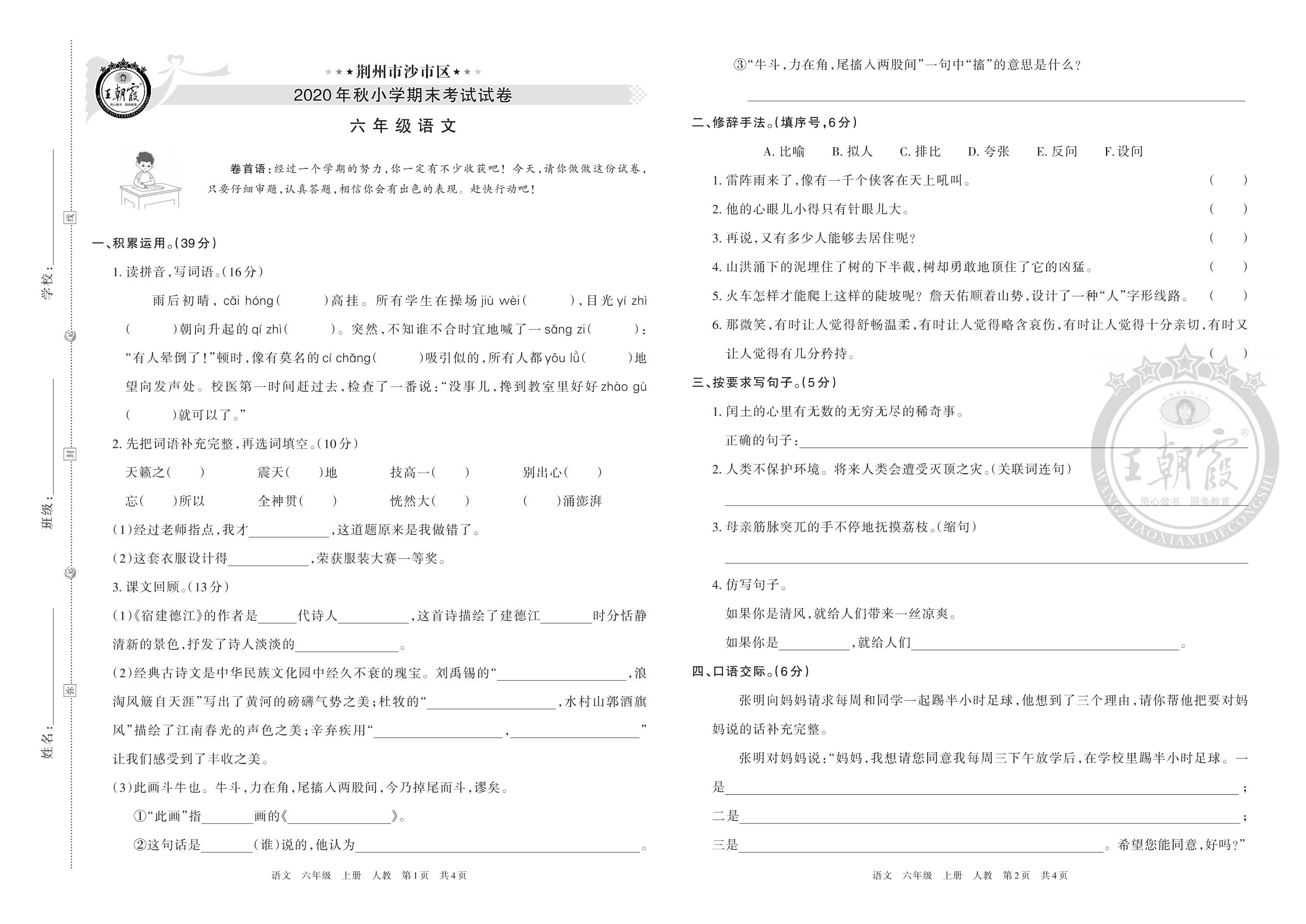 荆州市沙市区2020年秋小学期末考试试卷六年级语文(人教版)