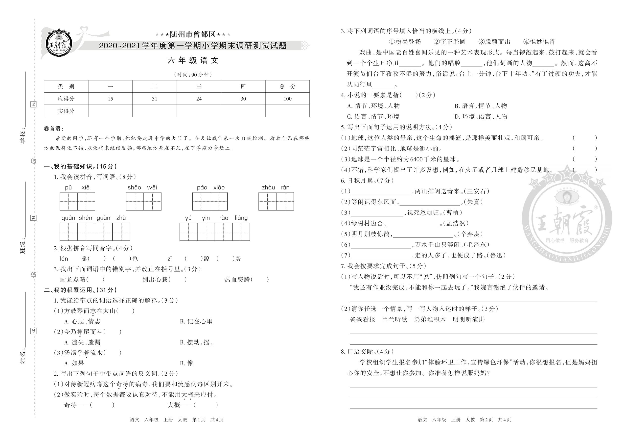 随州市曾都区2020-2021学年度第一学期小学期末调研测试试题六年级语文(人教版)