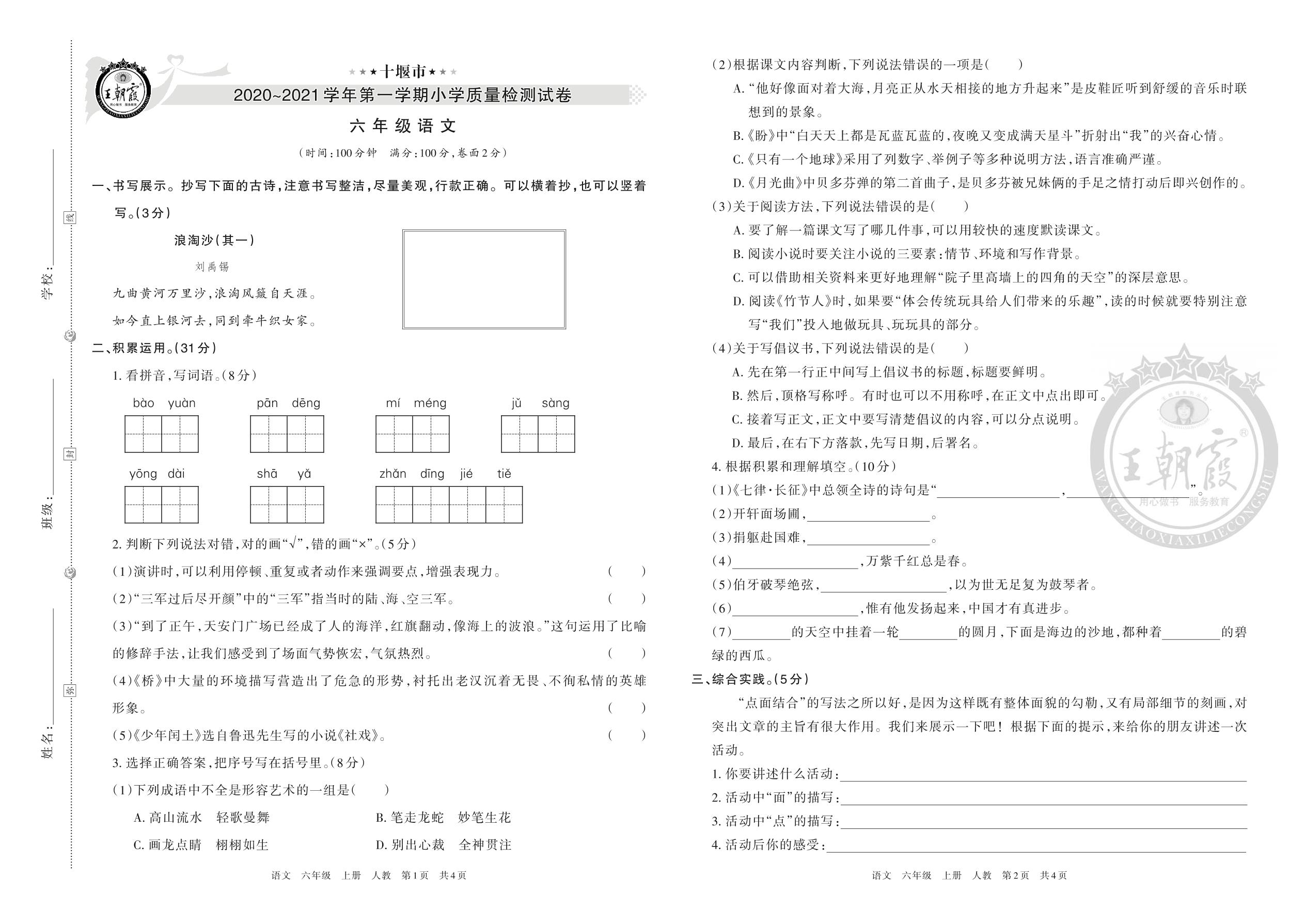 十堰市2020-2021学年第一学期小学质量检测试卷六年级语文(人教版)
