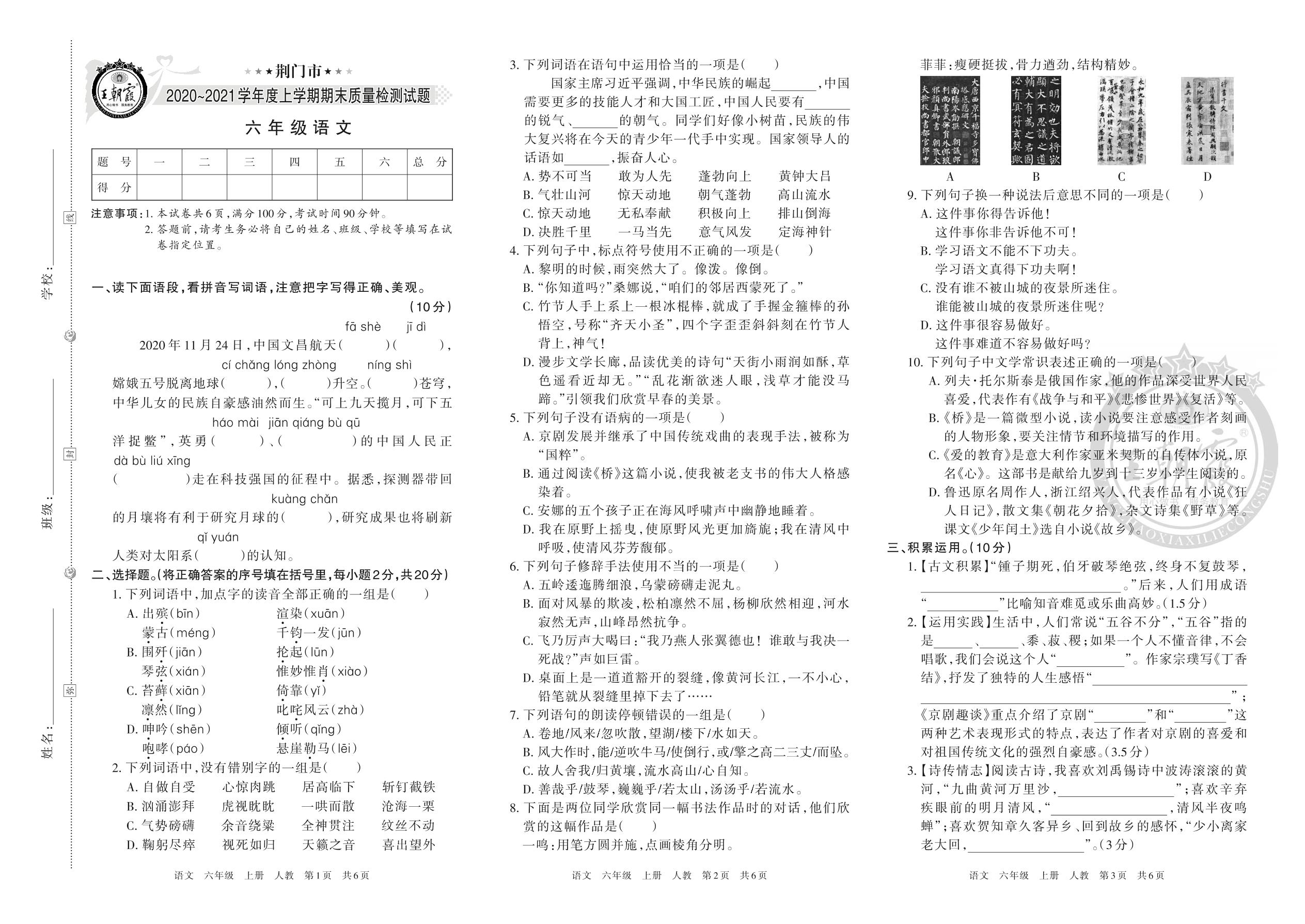 荆门市2020~2021学年度上学期期末质量检测试题六年级语文(人教版)