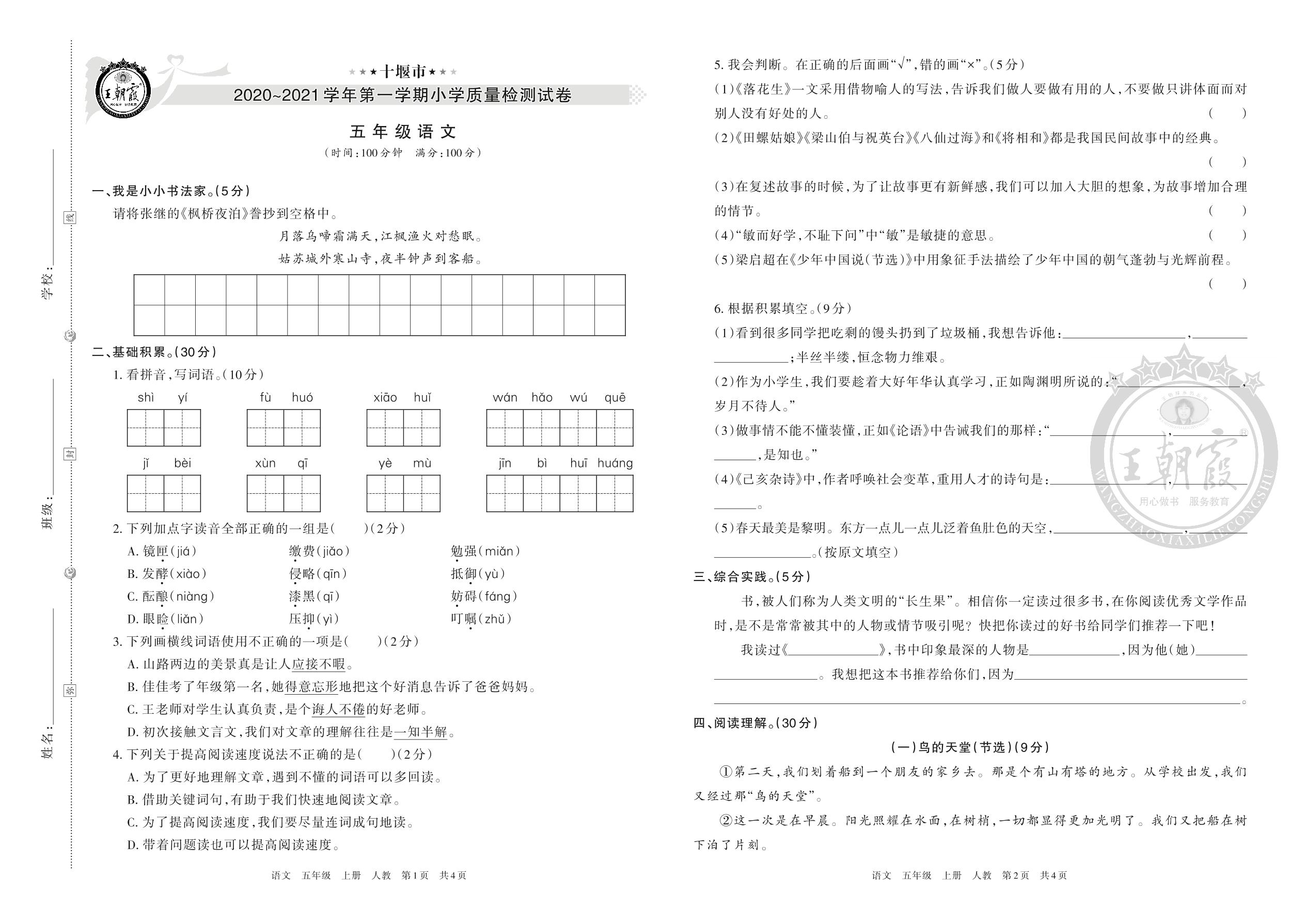 十堰市2020-2021学年第一学期小学质量检测试卷五年级语文(人教版)