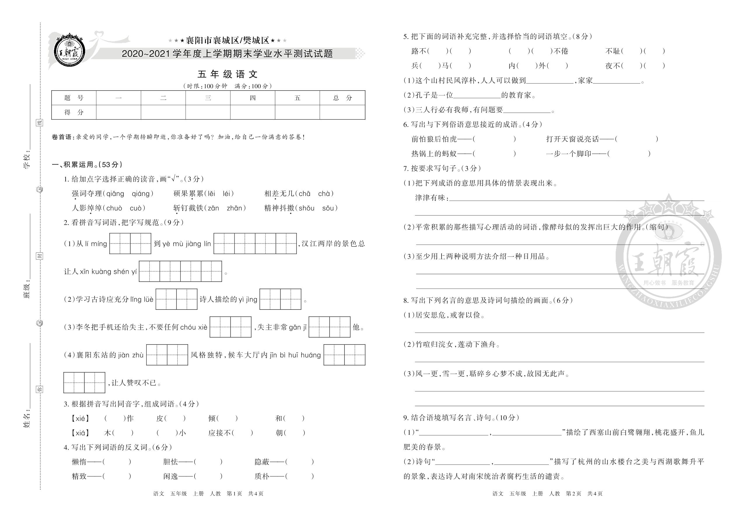 襄阳市襄城区、樊城区2020-2021学年度上学期期末学业水平测试试题五年级语文(人教版)