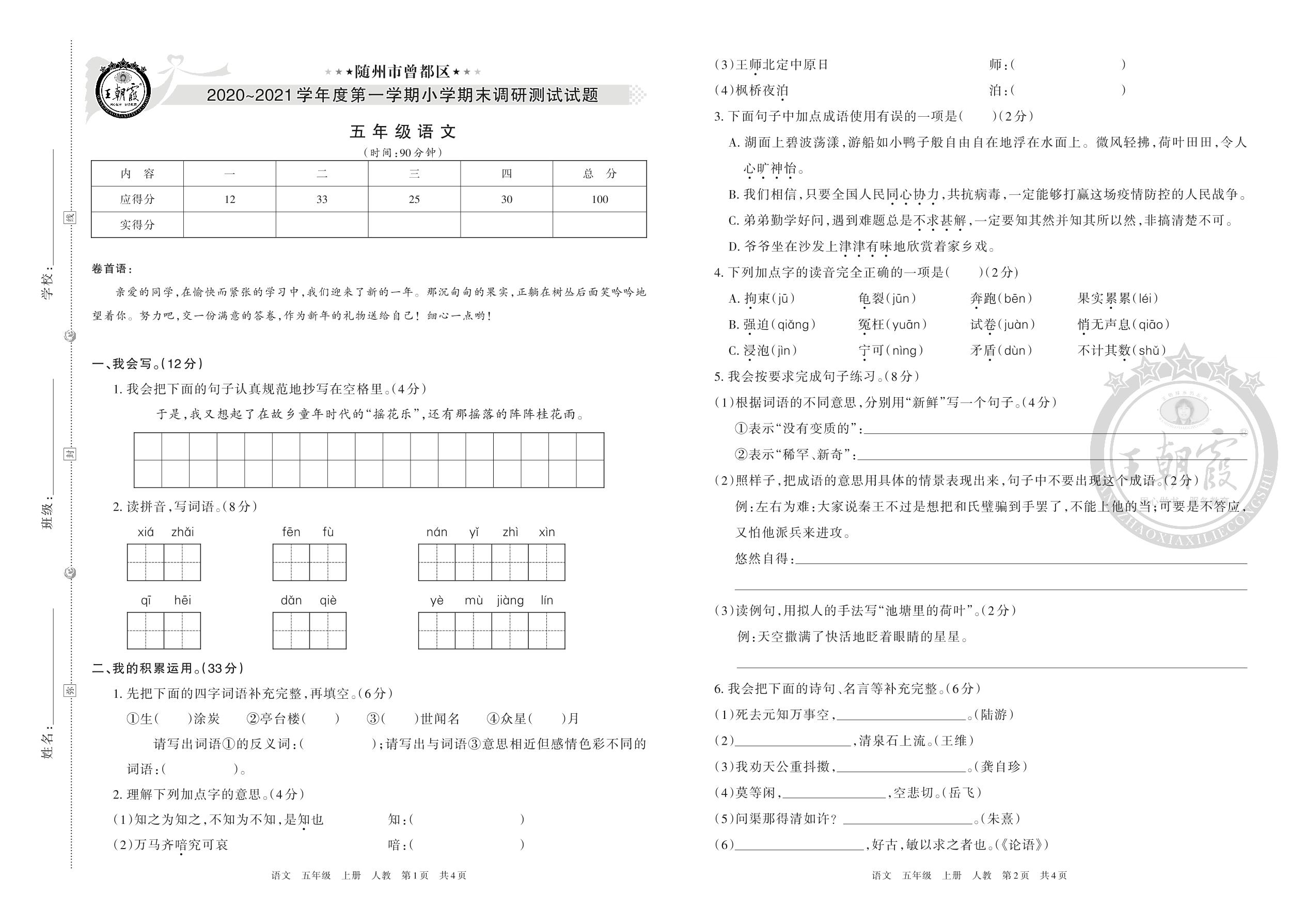 随州市曾都区2020-2021学年度第一学期小学期末调研测试试题五年级语文(人教版)