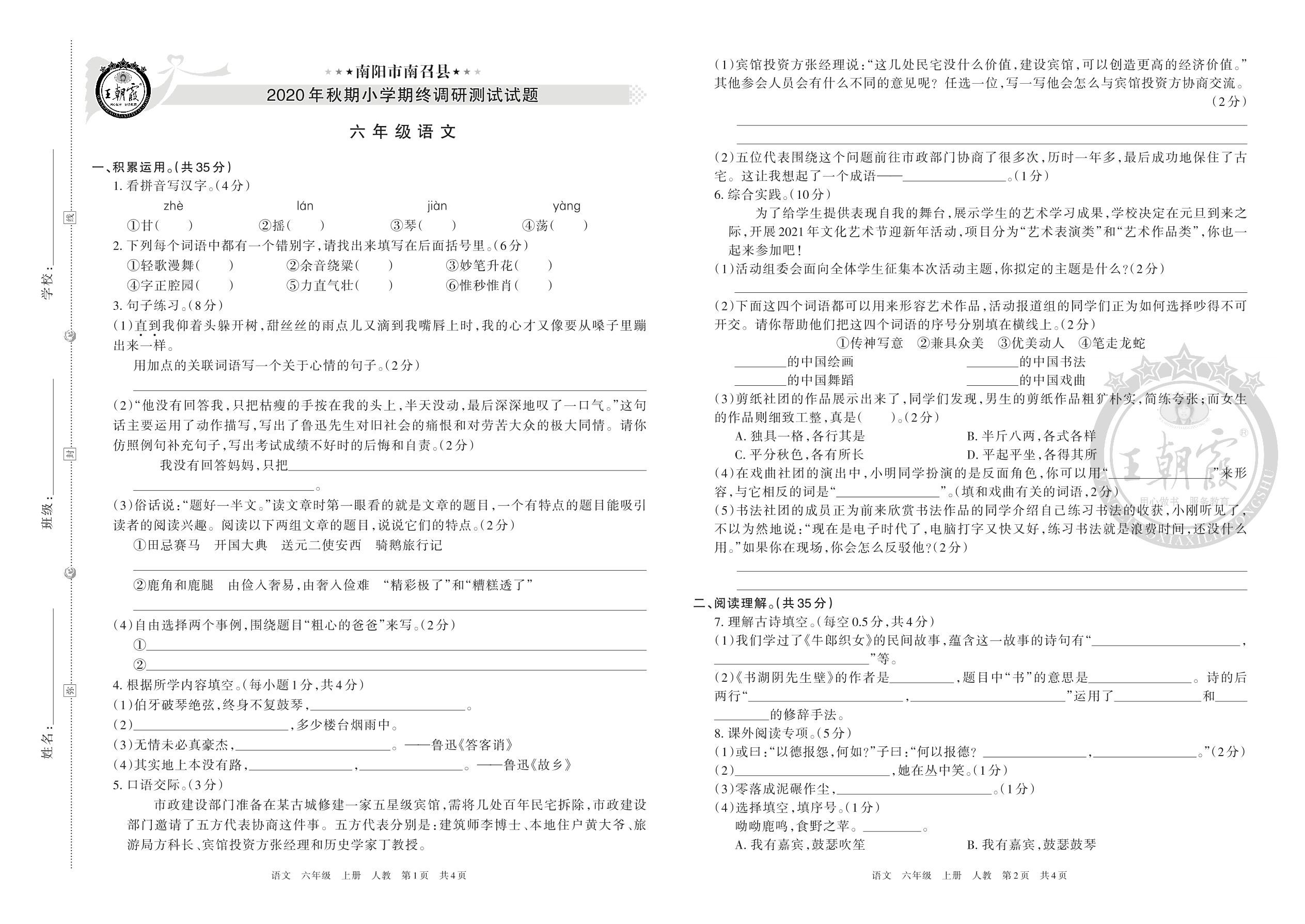 南阳市南召县2020年秋期小学期终调研测试试题六年级语文(人教版)