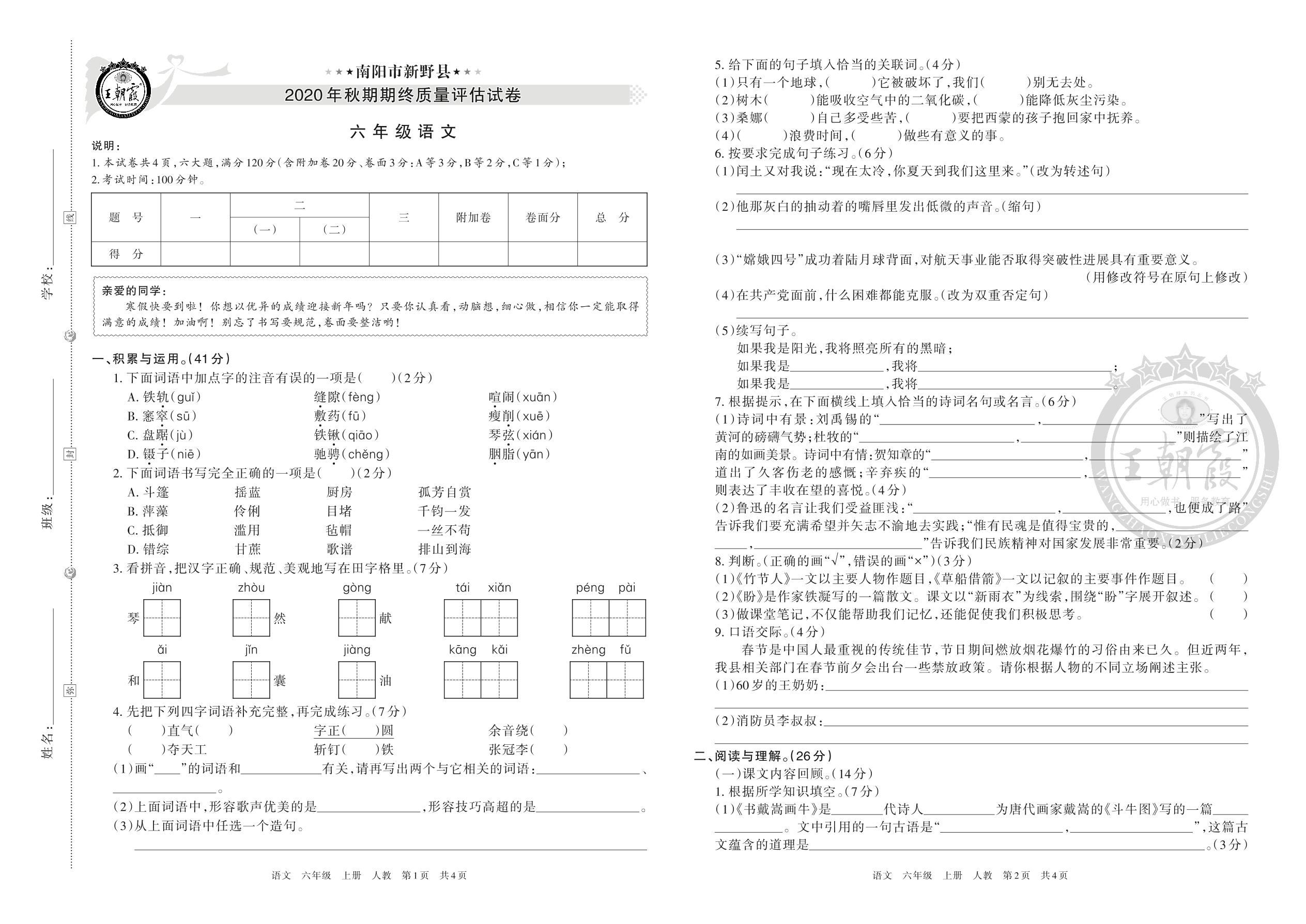 南阳市新野县2020年秋期期终质量评估试卷六年级语文(人教版)