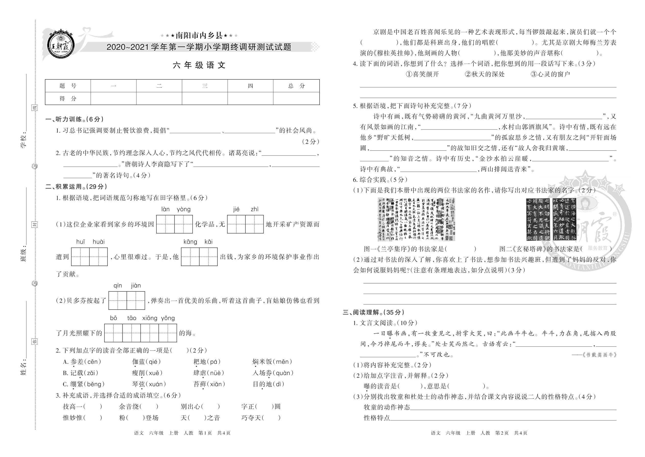 南阳市内乡县2020-2021学年第一学期小学期终调研测试试题六年级语文(人教版)