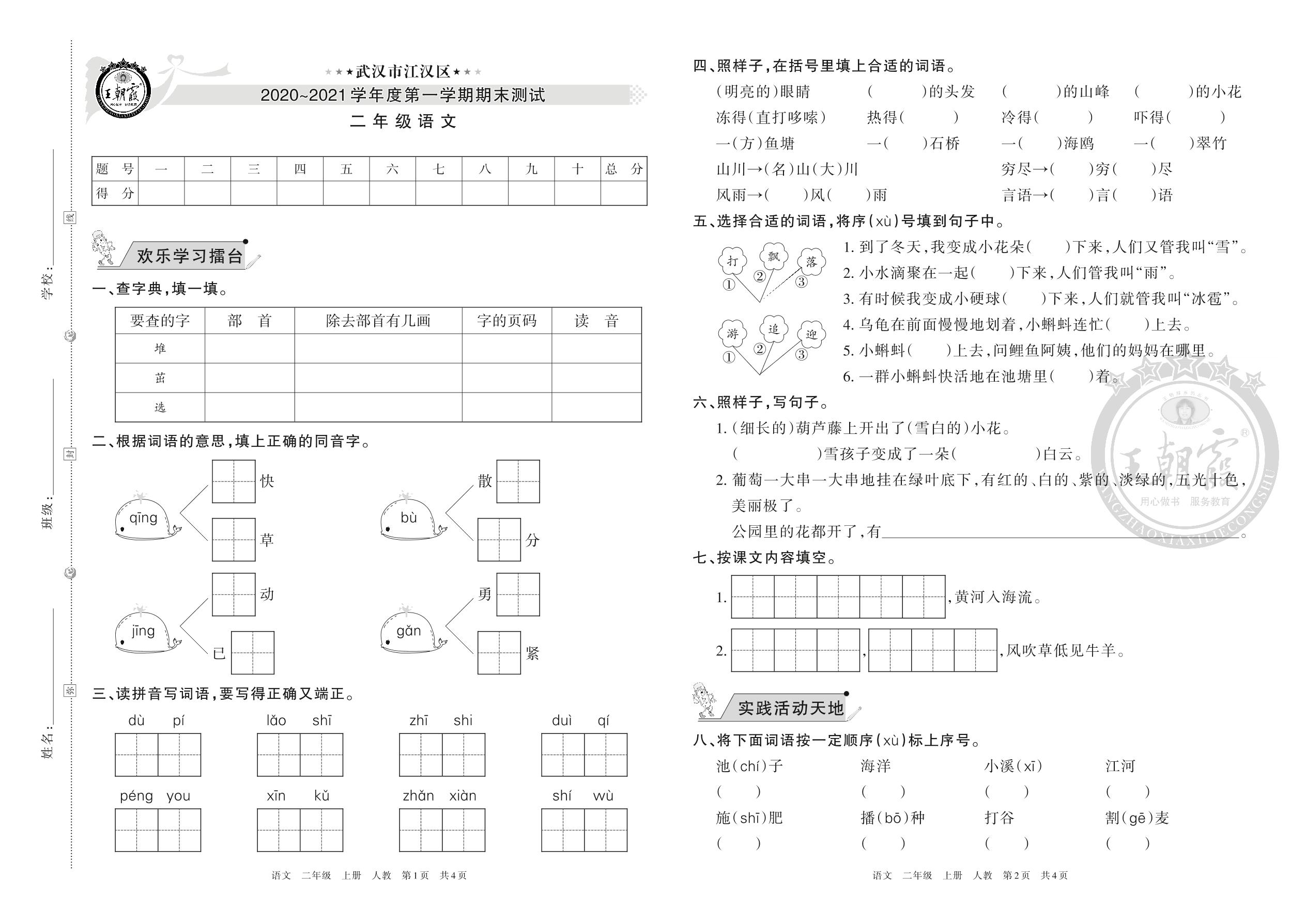 武汉市江汉区2020-2021学年度第一学期期末测试二年级语文(人教版)