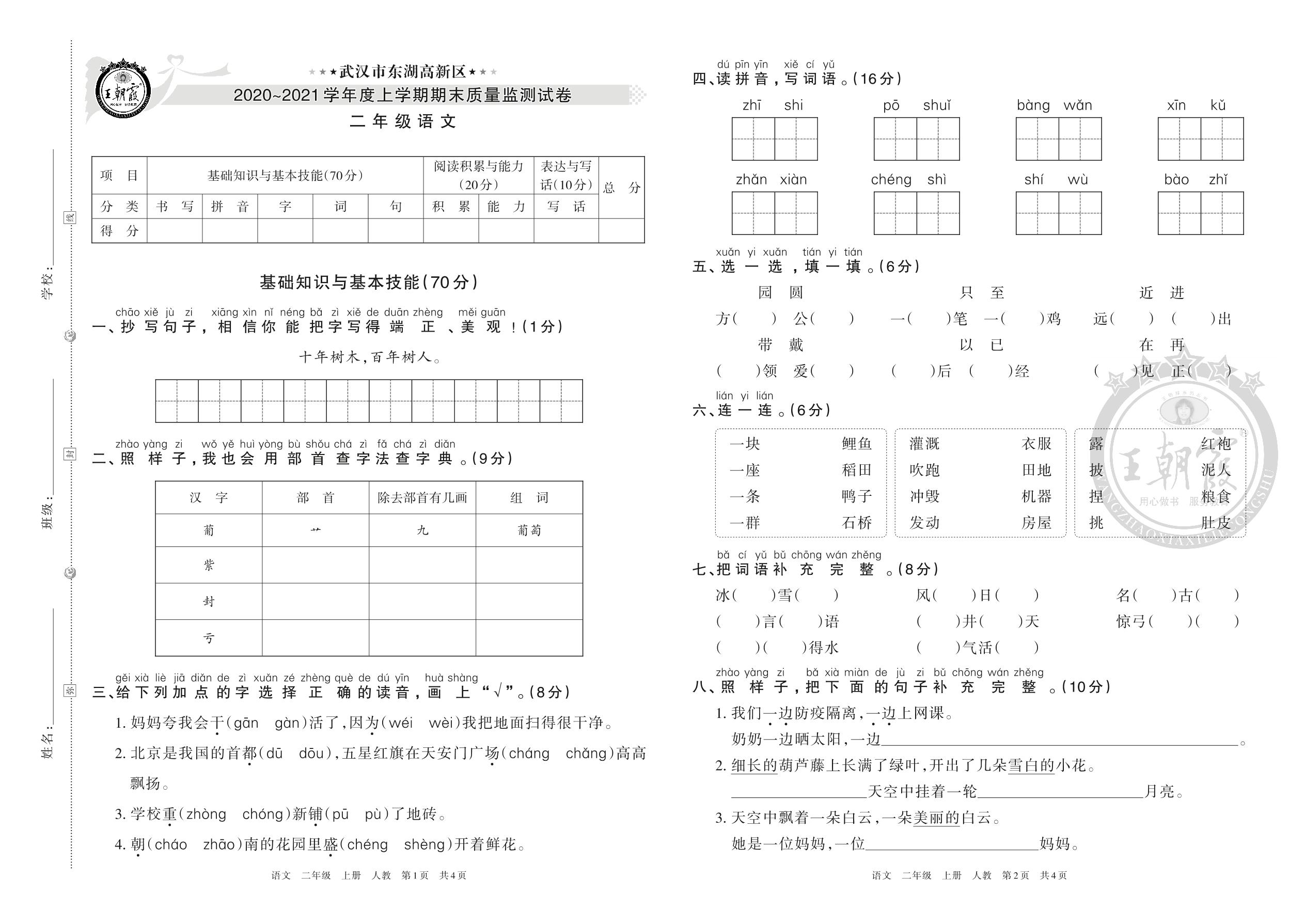 武汉市东湖高新区2020-2021学年度上学期期末质量监测试卷二年级语文(人教版)