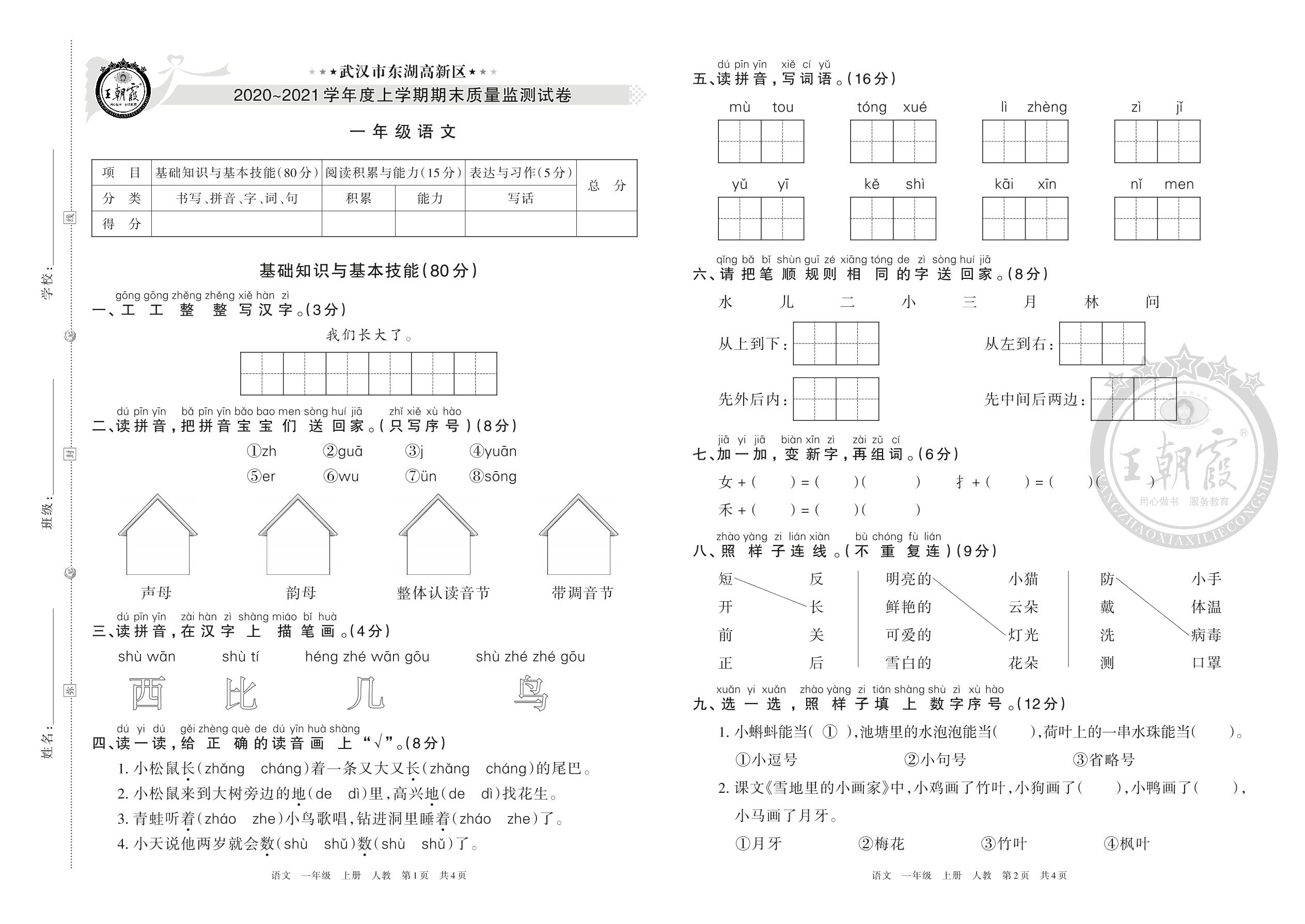 武汉市东湖高新区2020-2021学年度上学期期末质量监测试卷一年级语文(人教版)