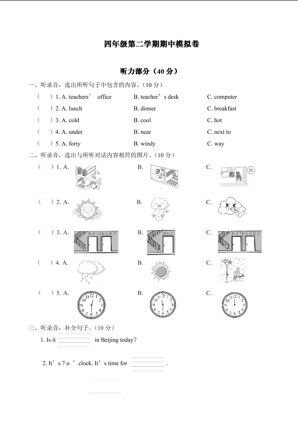 四年级英语人教PEP版(三起始)下册期中卷