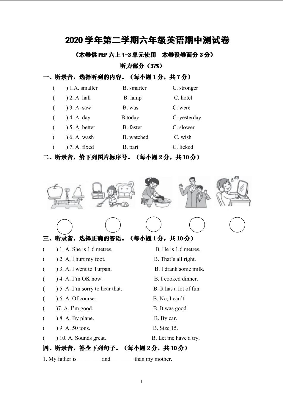 浙江省绍兴市诸暨市2019-2020学年第二学期期中考试试卷六年级英语(PEP版)【无听力音频】