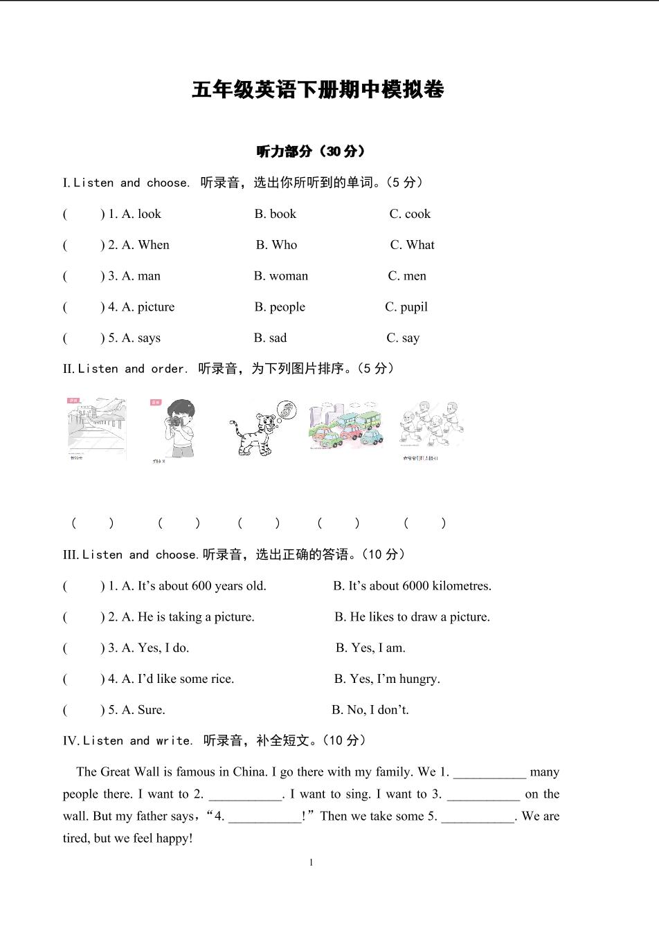 2020-2021学年第二学期期中考试模拟卷五年级英语(冀教版)【无听力音频】