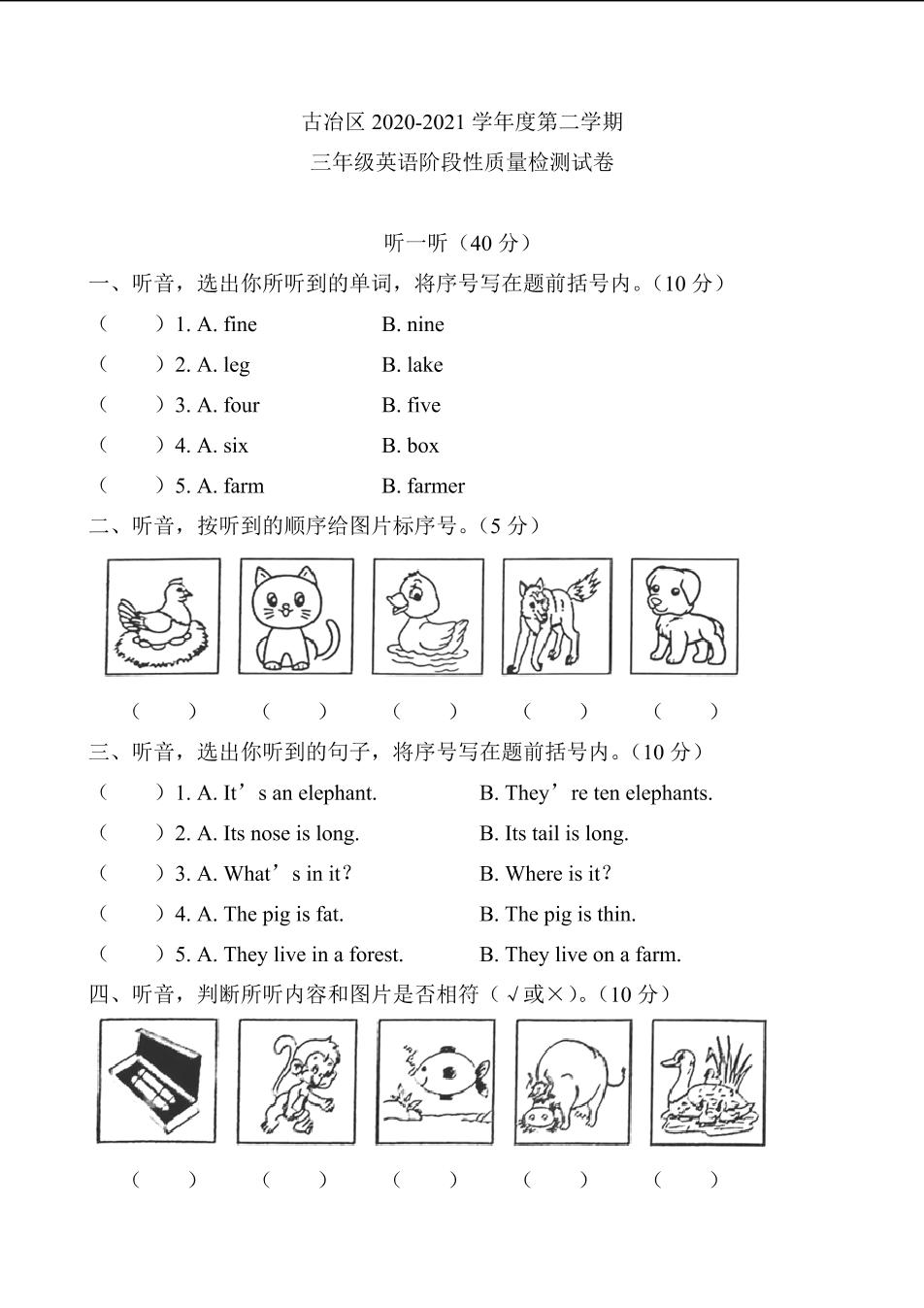 河北省唐山市古冶区2020-2021学年第二学期期中考试试卷三年级英语(冀教版)【无听力音频】