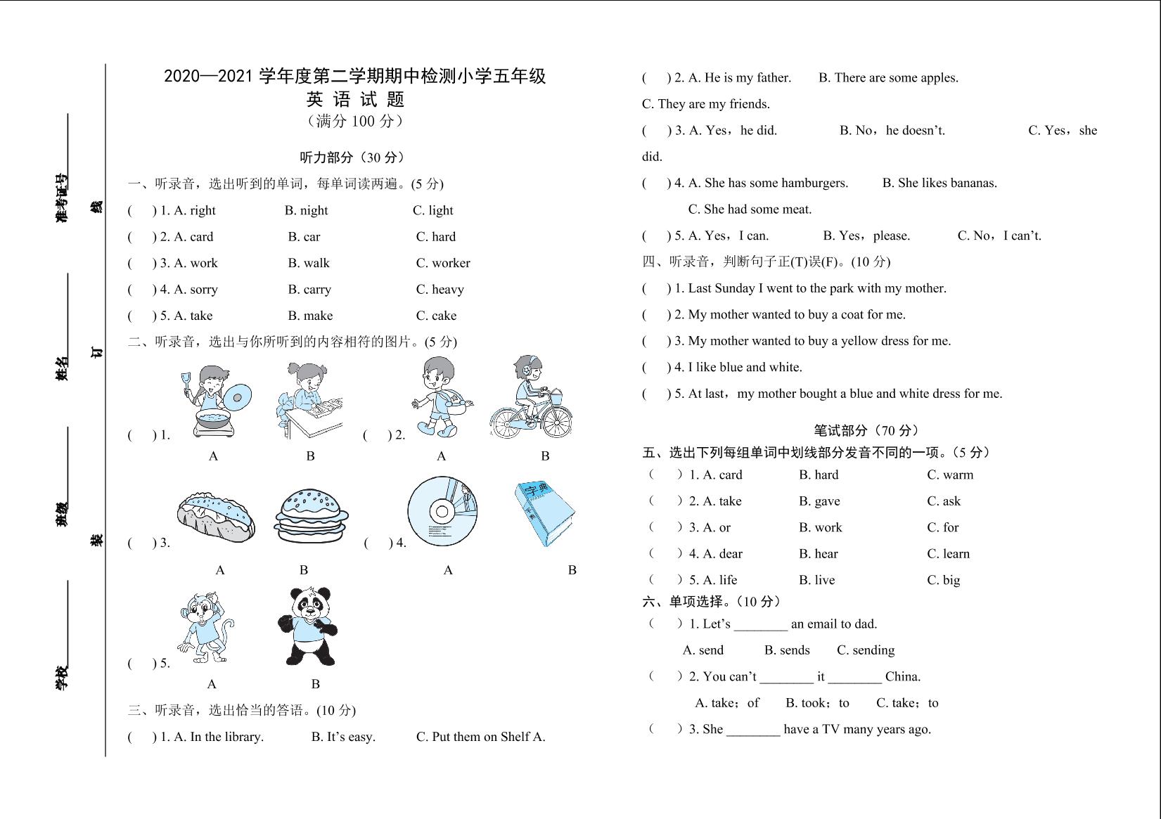 山东省德州市经开区2020-2021学年第二学期期中考试试卷五年级英语(外研版)【无听力音频】
