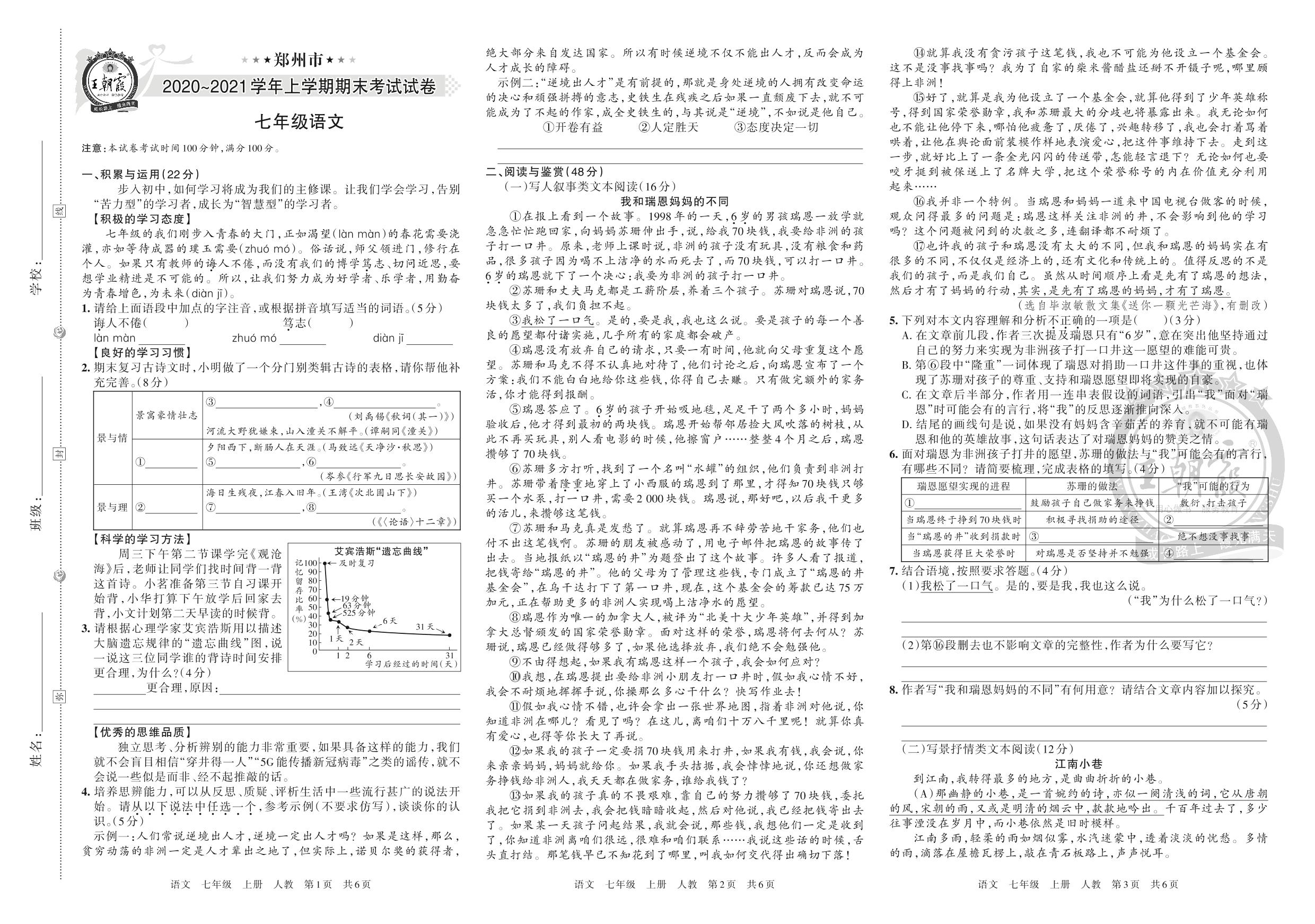 郑州市2020~2021学年上学期期末考试试卷七年级语文(人教版)_R220425152917545